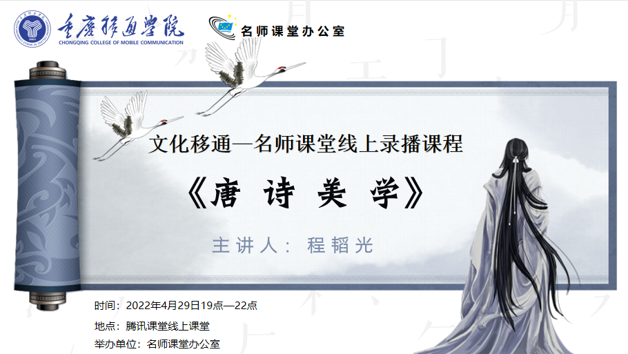 有那么一个人,站在中华灿烂文化的山峰之巅,身披一片明月,脚踩大唐盛世,手执酒壶,衣袂飘飞。他的诗豪迈奔放,飘逸出尘,意境奇妙,有着惊人的艺术想象力,所以他是世人心中的诗仙。他的才华不容置疑,更难得的是他在世俗面前不畏权贵的反抗精神和率性洒脱的真性情,他就是李白。4月29日晚7点,“名师课堂线上录播课程”播放了中南财经政法大学程韬光教授的《唐诗美学》讲座,带我们畅游“诗仙”李白的个人世界。