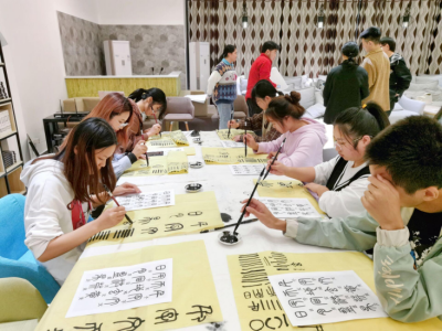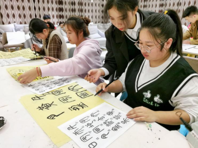 在之后的练习中,社团干部干事耐心的对同学们进行指导,及时纠正了同学们错误的握笔、运笔姿势。同学们逐渐掌握书写技巧后,迫不及待的开始尝试,不断克服问题,完成了自己的第一幅篆书作品。