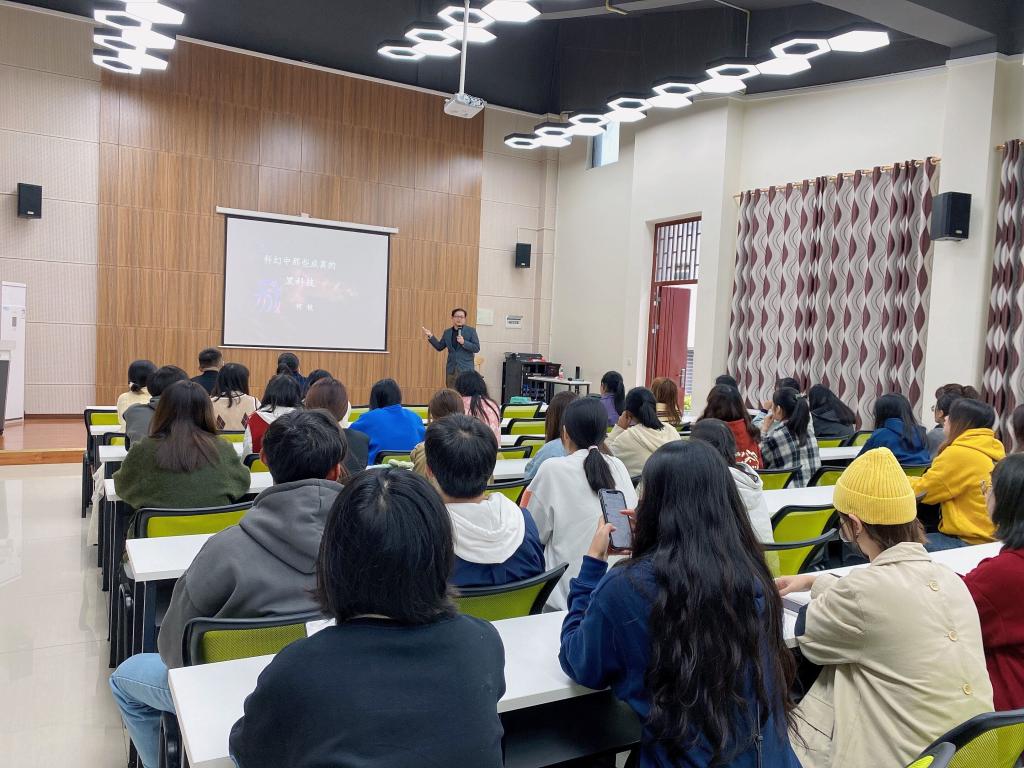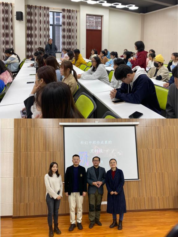 10月20日下午,外国语学院与钓鱼城科幻学院共同为我校科幻迷学生打造的科幻文化盛宴——《科幻中那些成真的“黑科技”》主题讲座在天渠报告厅举行。本次讲座邀请到了科幻学院何锐老师主讲,外国语学院ESP教研室曹阳阳老师主持,ESP教研室教师代表及英语专业学生到场共享了本次科幻文化盛会。