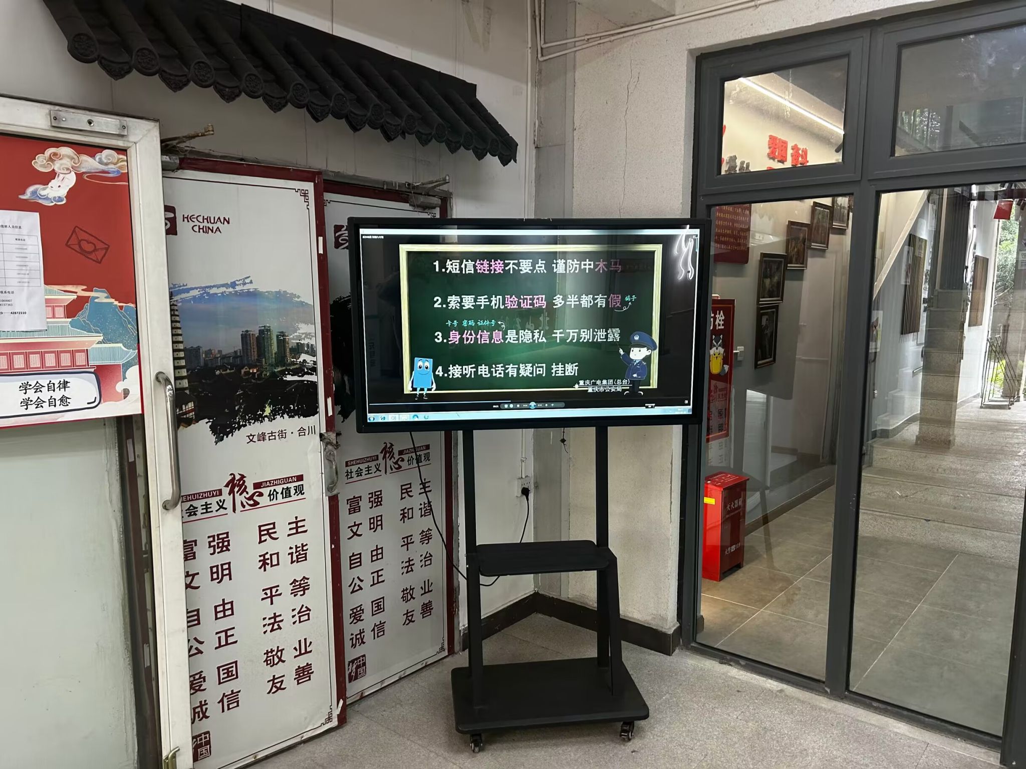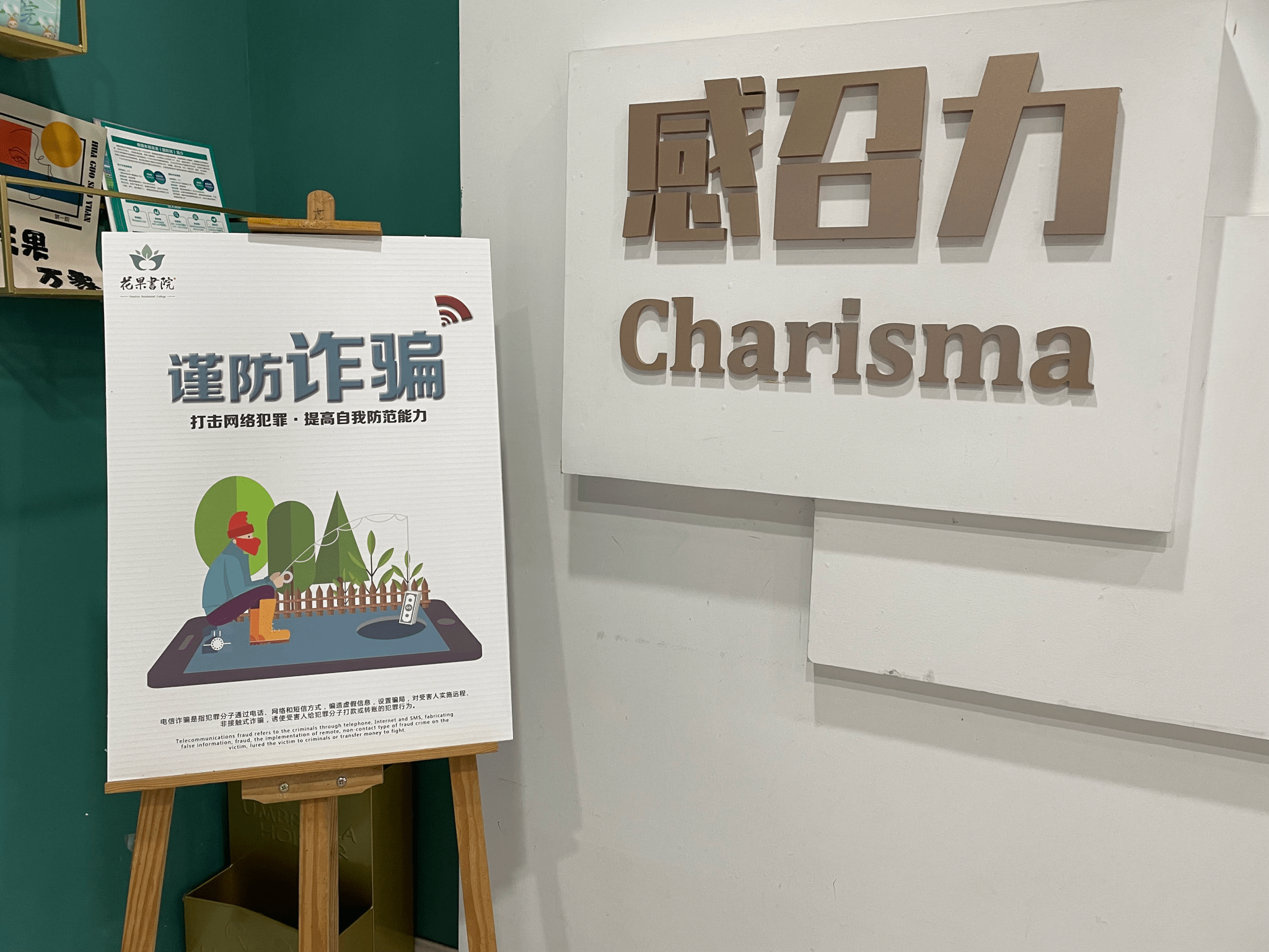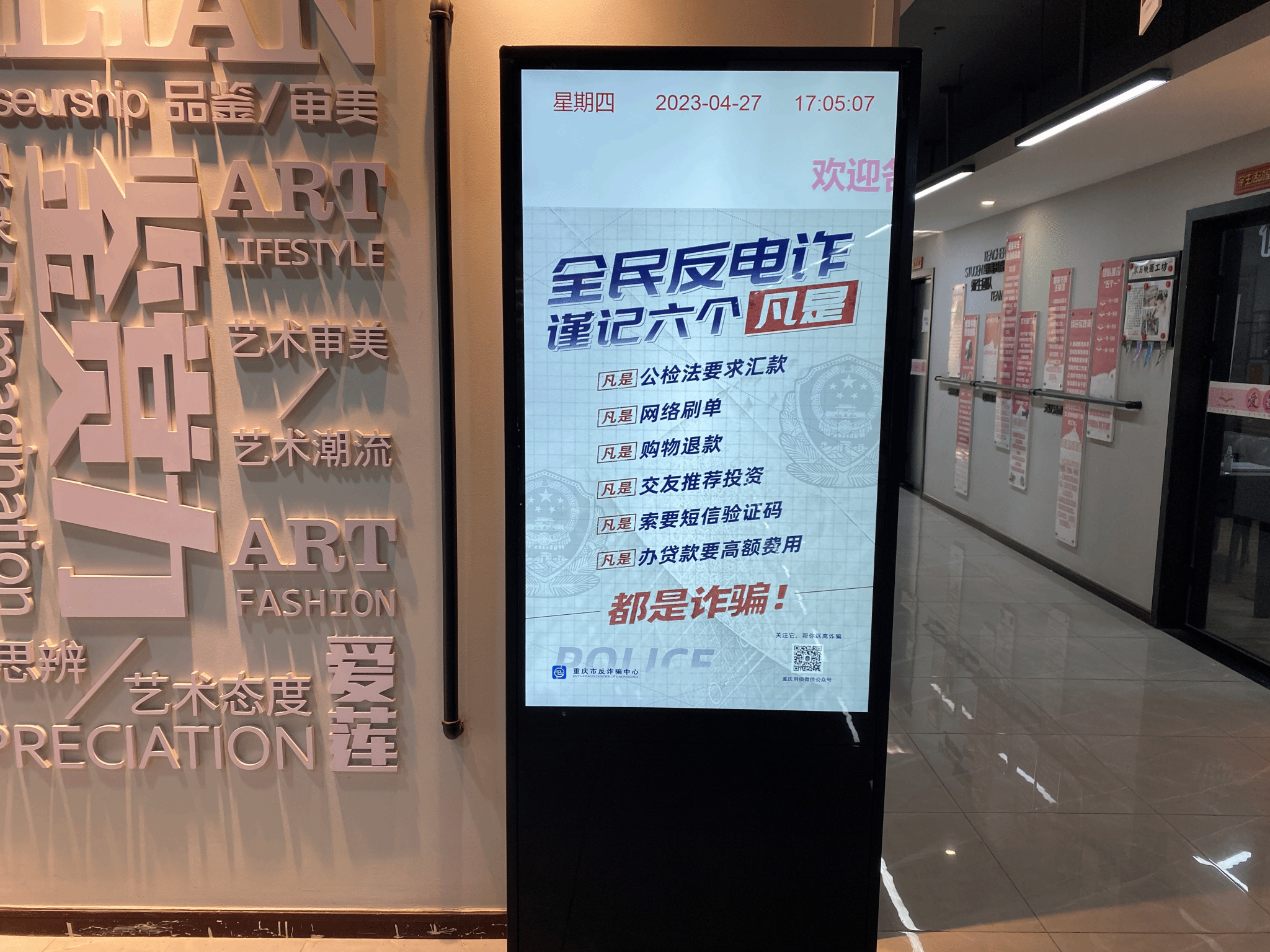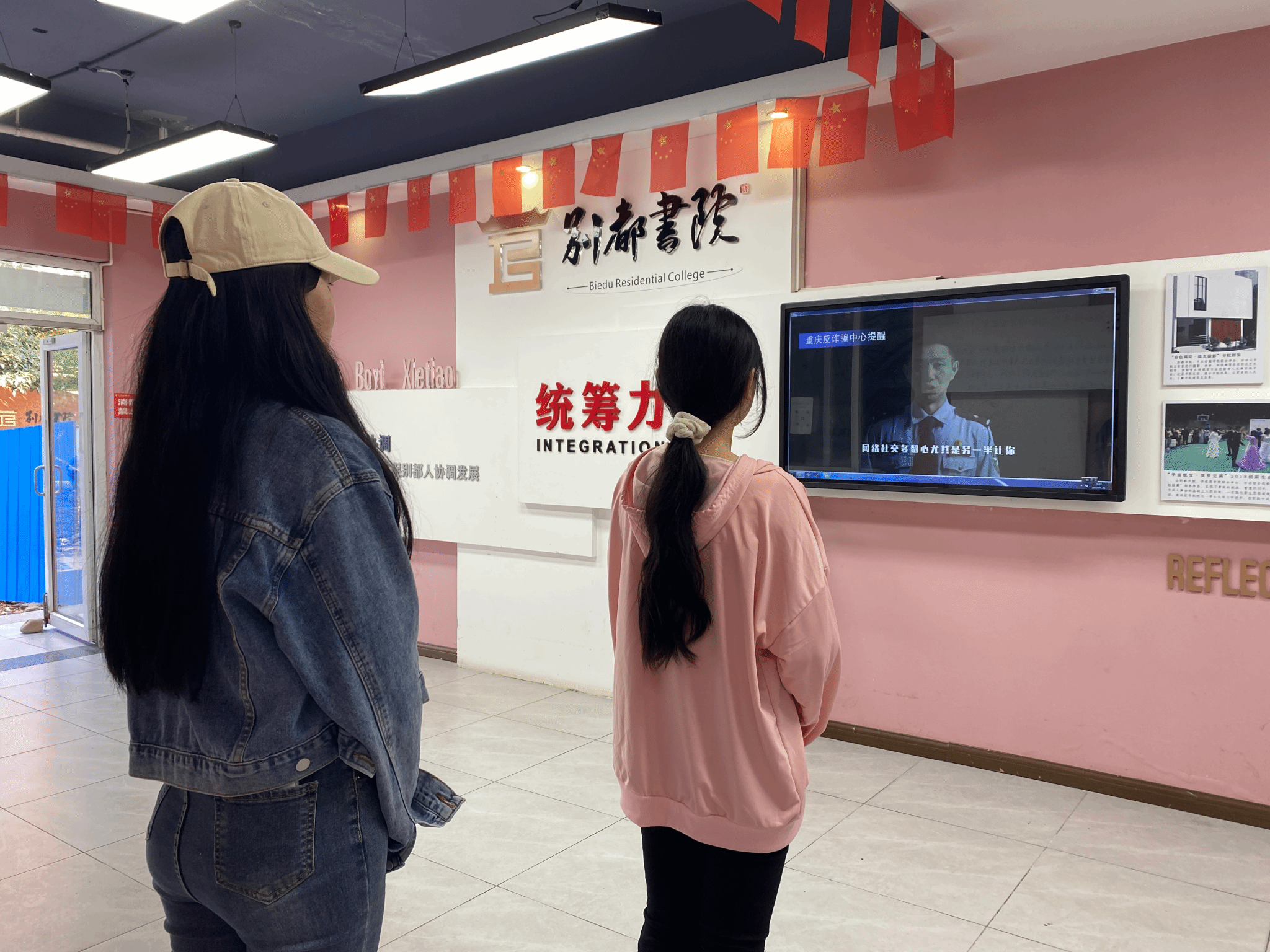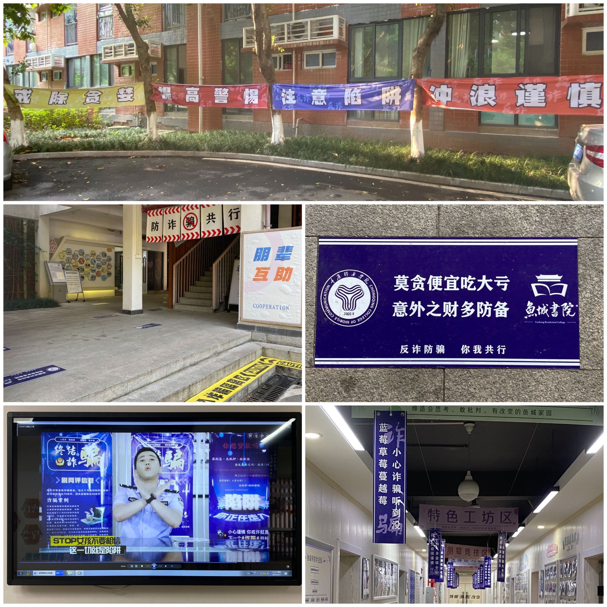 在空间建设方面,鱼城书院从外部空间到内部空间全面升级,通过地面标识、天花吊幅、反诈宣传篇播放等形式,从视觉到听觉、静态到动态,全天候全方位地为学生做好反诈骗宣传工作。