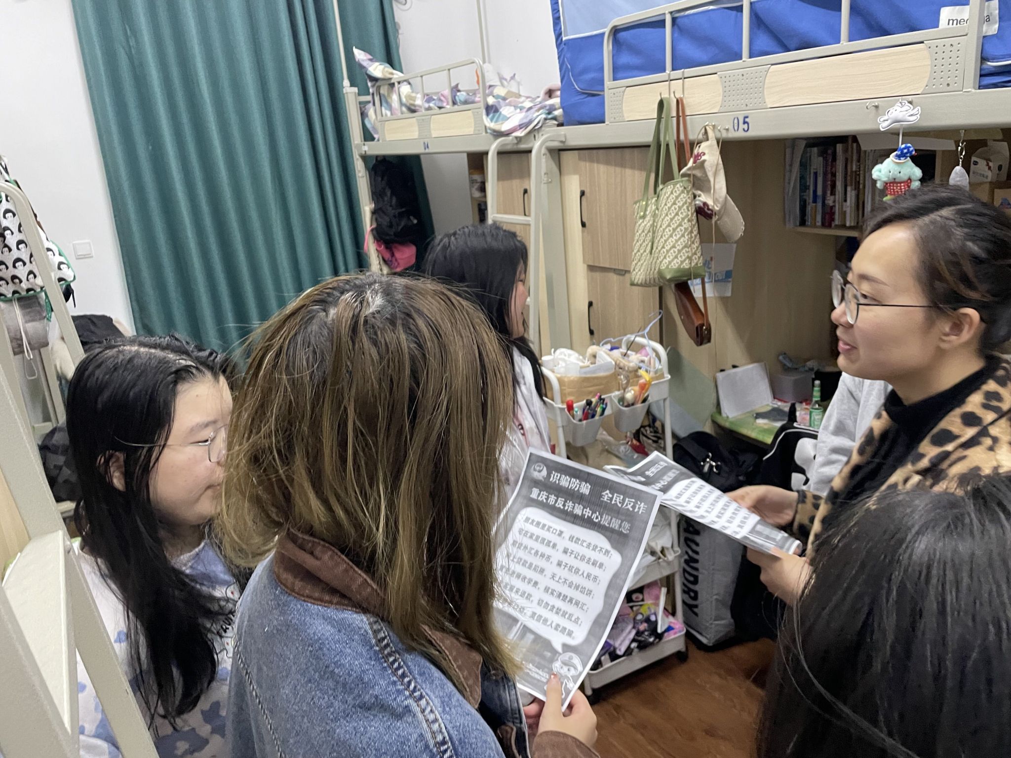 为进一步增强书院学子的防骗意识,提高学生的防骗能力,保护学生财产安全,天空书院4月开展防诈宣传主题教育,于书院空间投放宣传视频、书院楼栋群定时推送防诈信息等,进一步在学生心中树立“安全责任人”的意识;书院教师联动学院辅导员深入寝室进行防骗宣传,询问学生反诈APP、小程序的安装使用情况,用身边的典型案例对学生进行警示教育,必要时及时联系辅导员;结合全生异科导师在书院空间使用时,融入防诈宣传教育,做好学生安全意识提醒的每一步,引导学生预防诈骗,从我做起。