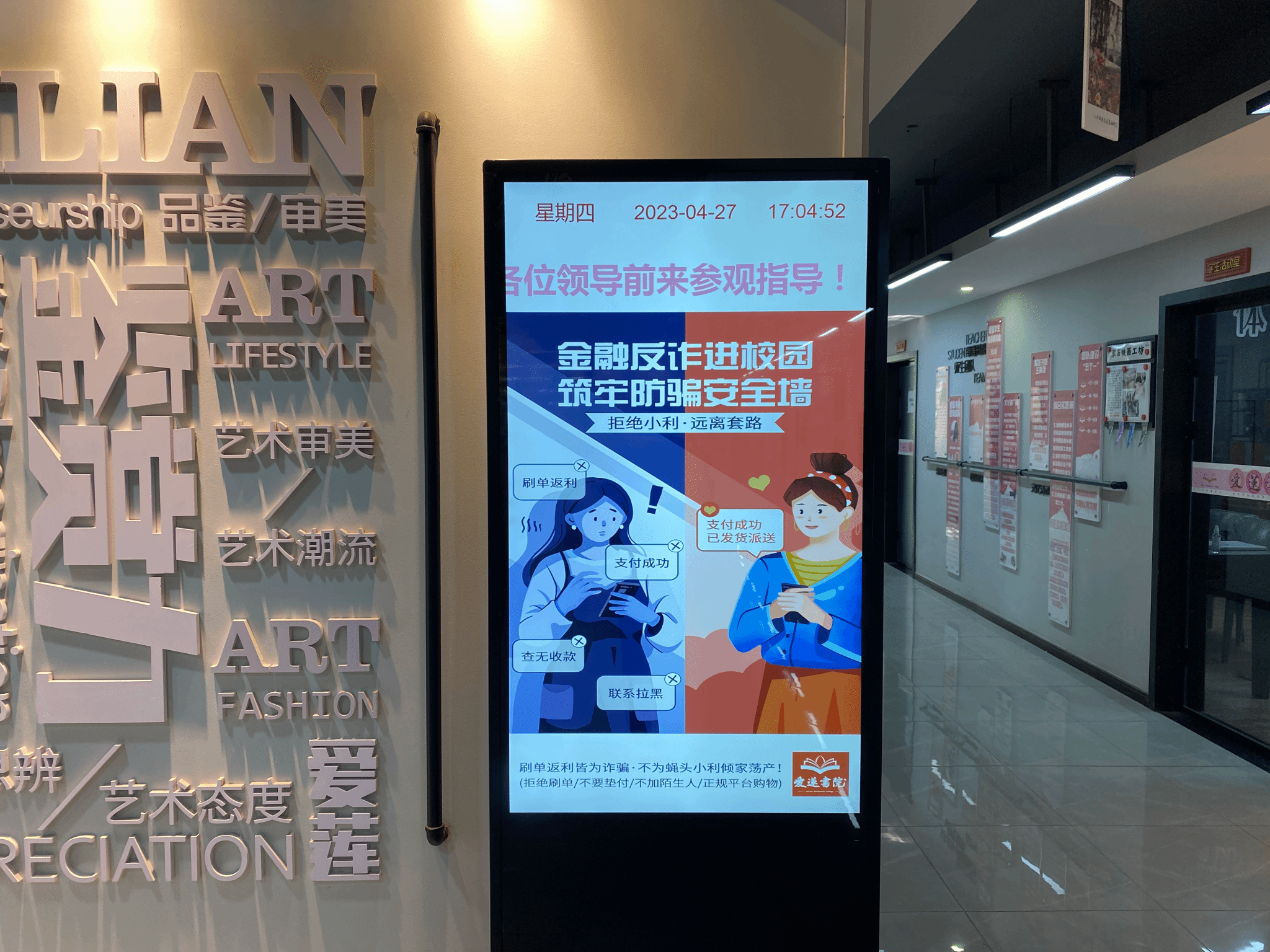 随着网络社交、在线购物等不断发展,日新月异的网络发展,电信诈骗手段也层出不穷。现如今,电信网络诈骗已成为当前发案最高、损失最大、群众反映最强烈的突出犯罪。为打击电信网络诈骗,保障同学们的财产安全,爱莲书院在空间打造关于推动学生反诈防骗的宣传。通过在广告机上,循环播放防诈图片,让同学们了解电信诈骗的内容,科普电信诈骗的知识,让同学们能够拥有防电信诈骗的意识。