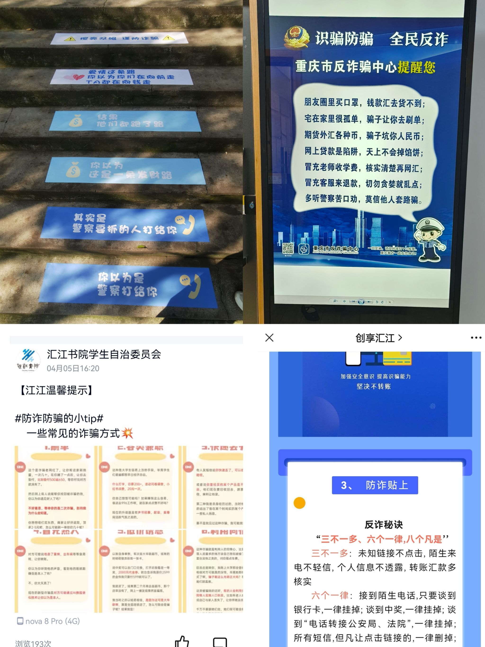 4月共组织书院自治委学生干部及书院学生代表参加2期以“反诈防诈”为主题的线下宣讲,结合大学生特点,重点讲解了刷单、电信诈骗、游戏交易等常见的诈骗方式案例,并现场指导同学们安装“国家反诈中心APP”和“合川反诈卫士”小程序。同时利用书院干道人流量较多的特点,张贴反诈地贴,时刻提醒同学们保持警惕,注意识别诈骗伎俩。也通过汇江书院官方QQ、微信公众号、书院入户广告机等宣传平台和方式实时发布关于诈骗的新闻、案例、注意事项等,提醒同学们防范于心,反诈于行。