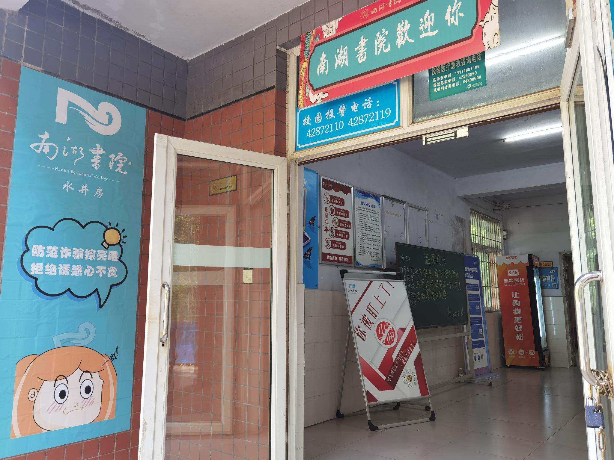 为加强学生反诈防骗意识、增强防范能力、掌握反诈技能,南湖书院利用宿舍楼栋入口处人员流动性强、进出流量大的特点,打造醒目反诈骗宣传区域,以风趣幽默、同学们喜闻乐见的方式,设计安装了多块图文并茂、通俗易懂的反诈宣传内容,全区域覆盖宣传面。
