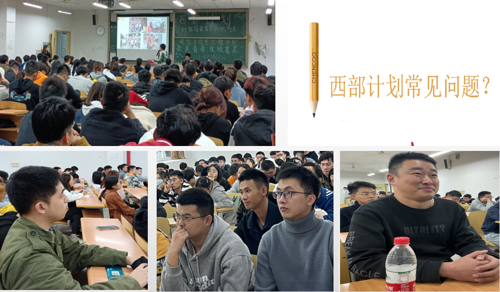 “当今广袤的西部正逐渐成为广大青年干事创业、实现青春梦想的新热土和蓝海,功成不必在我,功成必定有我,青年人应以志愿者为榜样,到基层和人民中去建功立业,去实现自己的价值。”倾听完两位校友的分享后,同学们心中起了一些小小的疑惑,有同学问道:“西部计划志愿服务中,工作岗位可以自己选择吗?”夏小钞校友回答说:“工作岗位是不可以自己选择,但是自己可以选择西部计划网中开放中的服务区域,比如已出公告的区、县”。在校友们的讲述中,西部计划的神秘面纱也为大家缓缓揭开:作为国家重大人才工程“高校毕业生基层培养计划”的子项目,西部计划是引导和鼓励高校毕业生到基层工作的5个专项之一。