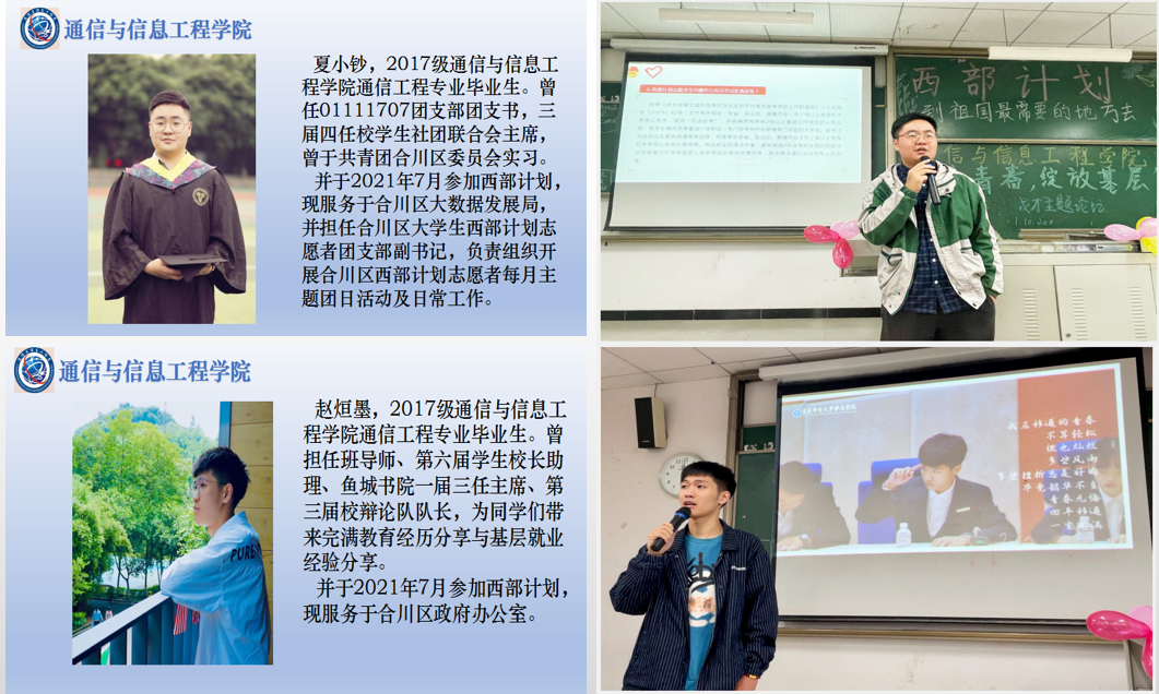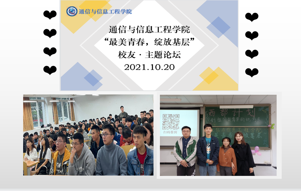 到西部去,到祖国最需要的地方去。为使同学们更了解西部计划,鼓舞优秀的大学生参与到志愿服务中,到祖国西部基层倾情奉献,2021年10月20日12点30分,由校友工作办公室主办、通信与信息工程学院承办的第112期“校友·成才”主题论坛活动在4101教室有序开展,本次论坛活动邀请到夏小钞和赵烜墨两位实力校友作为主讲嘉宾为到场的168名同学进行宣讲。