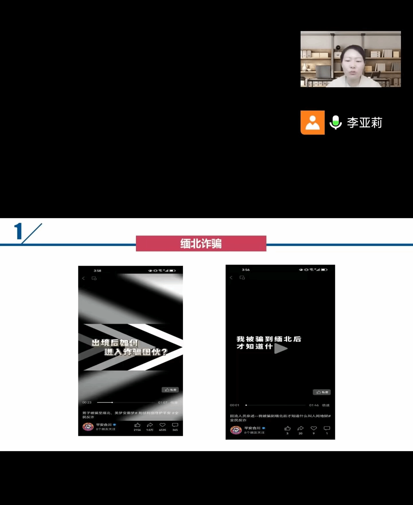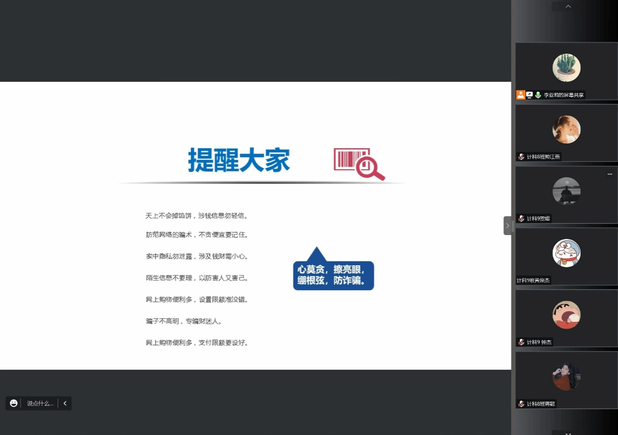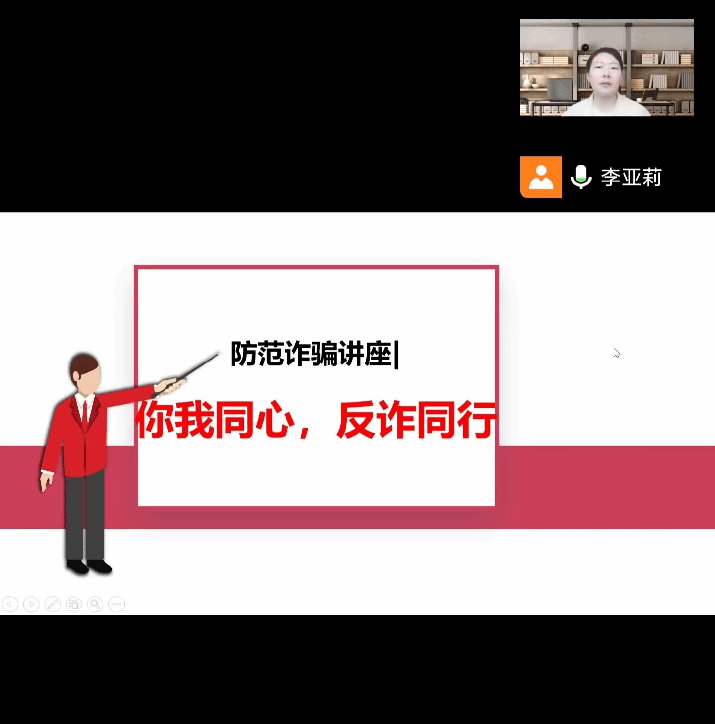 为了让广大同学擦亮双眼,避免陷入诈骗陷阱,李亚莉异科导师小组成员于4月23日下午六点半通过腾讯会议开展了“你我同心,反诈同行”的主题防范诈骗分享会,李老师主要讲述了常见的诈骗类型和套路,并通过视频的方式让大家直观了解了诈骗的过程,最后通过反诈骗测试题来加强同学们对反诈知识的印象。