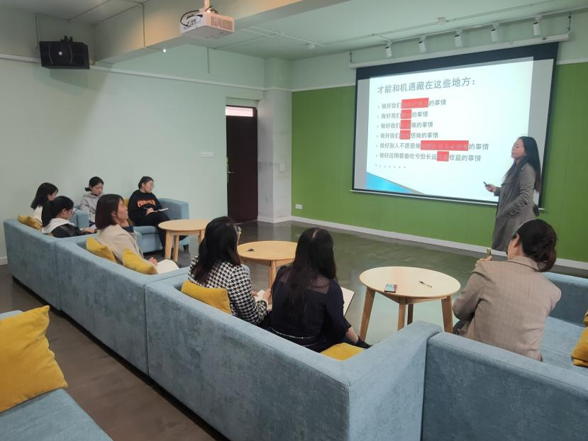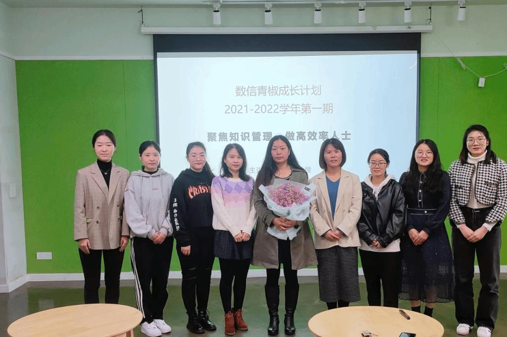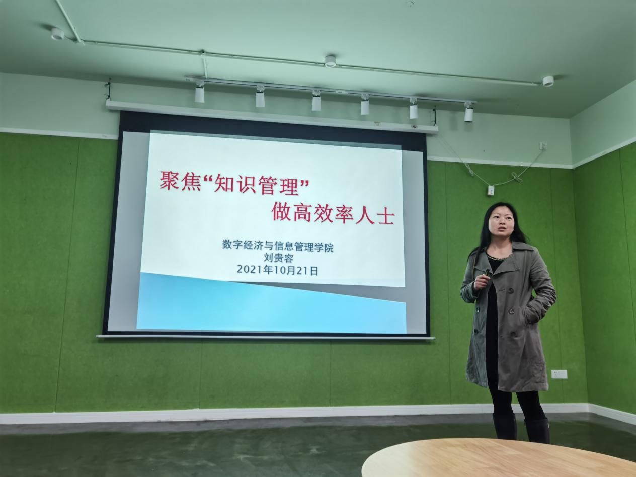 10月21日上午10点,数字经济与信息管理学院学生工作团队在双栀书院多功能影音室举行本学年第一期青椒成长计划之“聚焦知识管理,做高效率人士”。此次培训邀请到数字经济与信息管理学院副院长刘贵容教授担任主讲人,参加此次青椒成长计划的为数信学院学工副院长任瑞娟老师以及学工队伍全体辅导员老师。