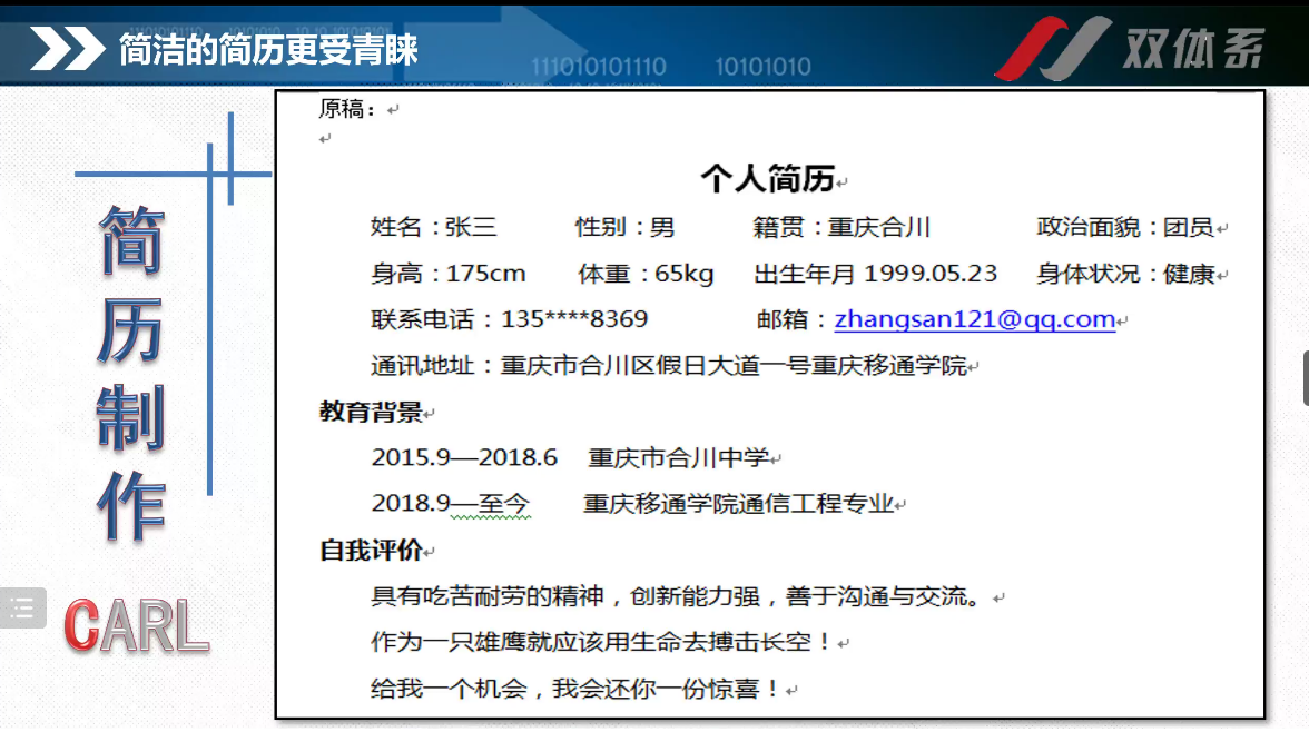 胡肖潇老师首先抛出“简历的目的是什么?”这一问题,引发同学思考。没有人会因为一份写满文字的简历而选择一个人,制作简历是为了获得面试机会,让HR对“我”感兴趣,进而以此帮助同学们明白简历就是求职的一块敲门砖。