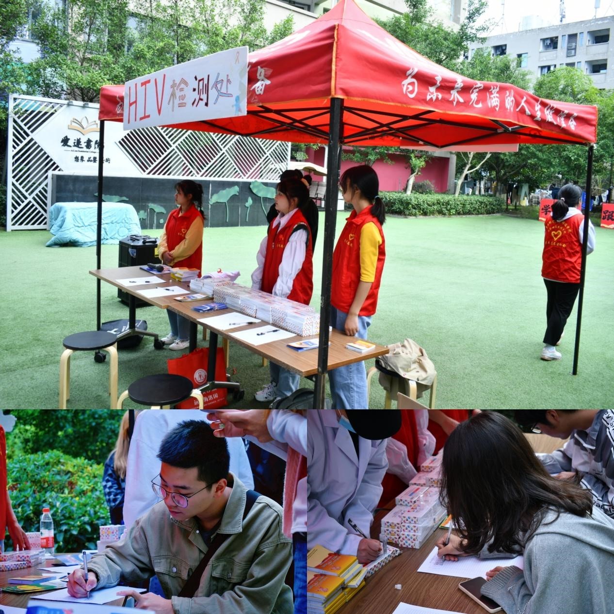 自检不能仅限于知识层面,更要从实际行动开始。志愿者们在爱莲书院门口外设立了保密、免费、专业的HIV唾液检测服务点,防艾检查让同学们明白防艾不是靠话语,爱护自己从实际行动出发,预防艾滋从现在开始。