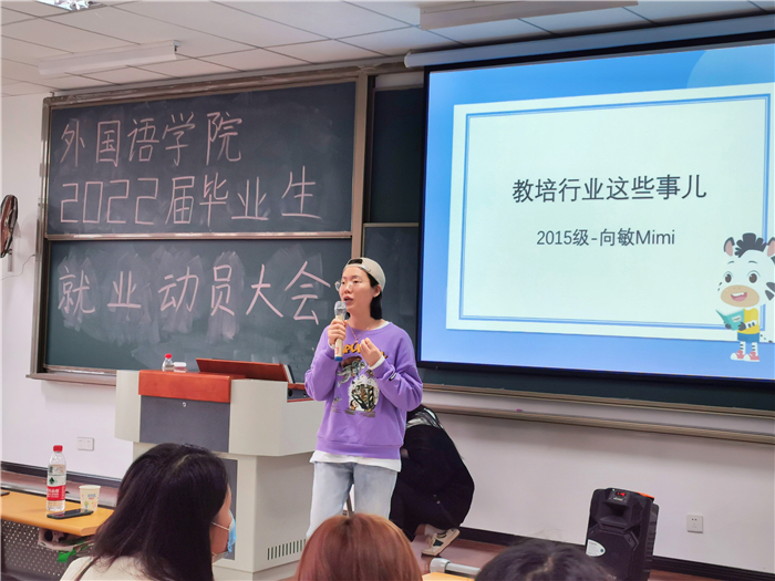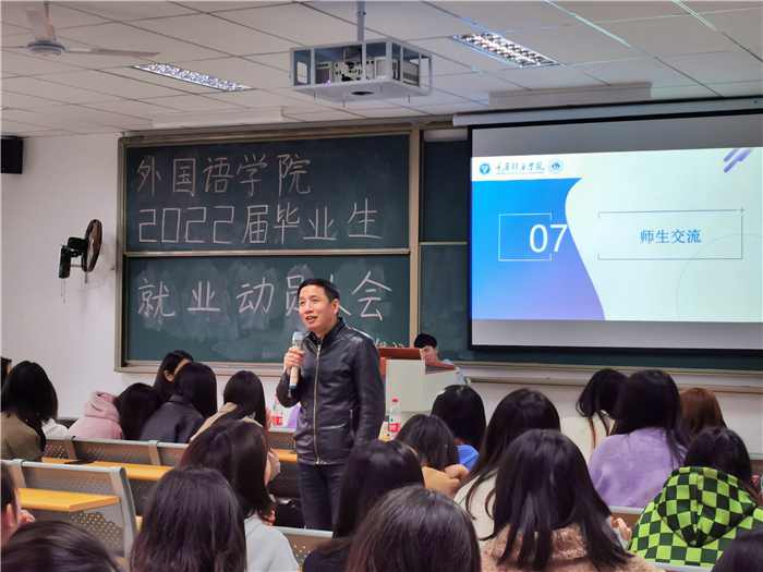 2021年国家“双减”政策的颁布,使大量教培行业人员被裁员下岗,考公考研难度加大。祝玮副院长秉承着“语言是一种工具”,和同学们探讨了就业方向。从非学科培训行业、新兴培训行业、跨专业就业这三个方向,鼓励同学们充分发挥自己的优势,展示自己得能力,拓宽自己的就业渠道,提升自我的综合价值。