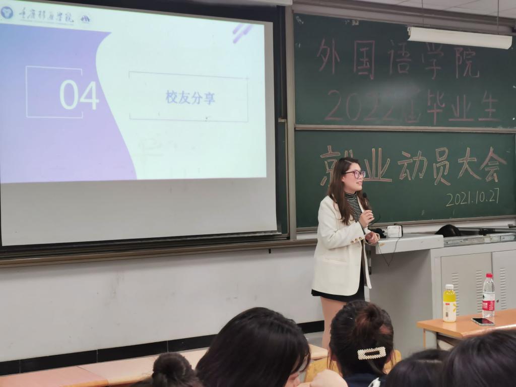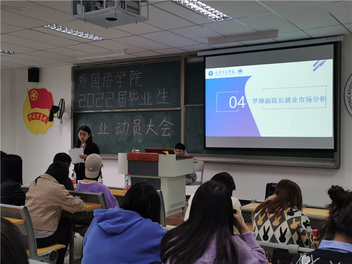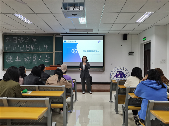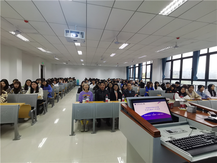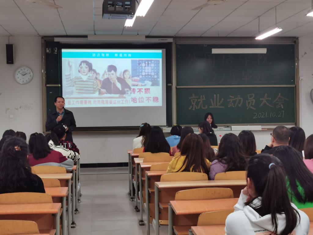 2021年10月22日、27日,外国语学院举行了2022届毕业生就业动员大会。本次动员大会旨在引导广大毕业生正确认识自己,认清就业形势,适时调整就业期望,提高就业意识,开拓就业视野和就业渠道。为同学们更好地了解自我、规划人生,为积极就业提供可借鉴的帮助。