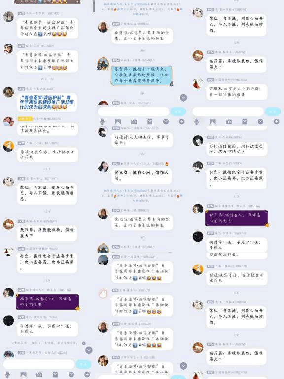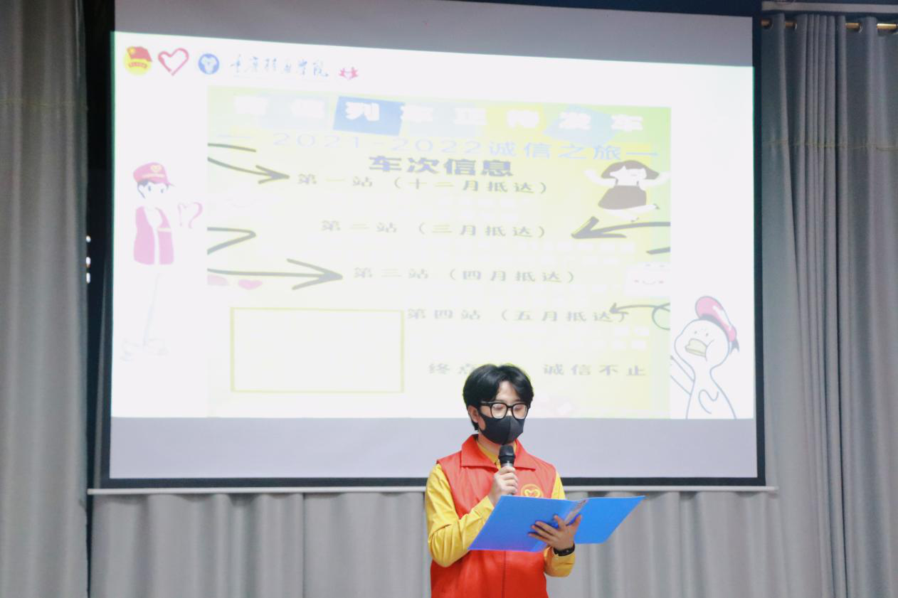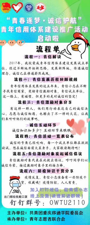 为进一步加强青年信用体系建设,强化青年诚信意识,引导学生树立正确的世界观、人生观、价值观,营造“树诚信学风·做诚信学子”的校园氛围,建设诚信校园。面临突发疫情,我校积极响应疫情防控要求,为保障同学们的安全,减少人员聚集,特以线上直播与线下青信激励对象风采展相结合的方式开展此次活动。2021年11月7日19:00青年志愿者联合会在钉钉线上直播成功举办了“青春逐梦·诚信护航”青年信用体系建设推广活动,全校共800余人参与。