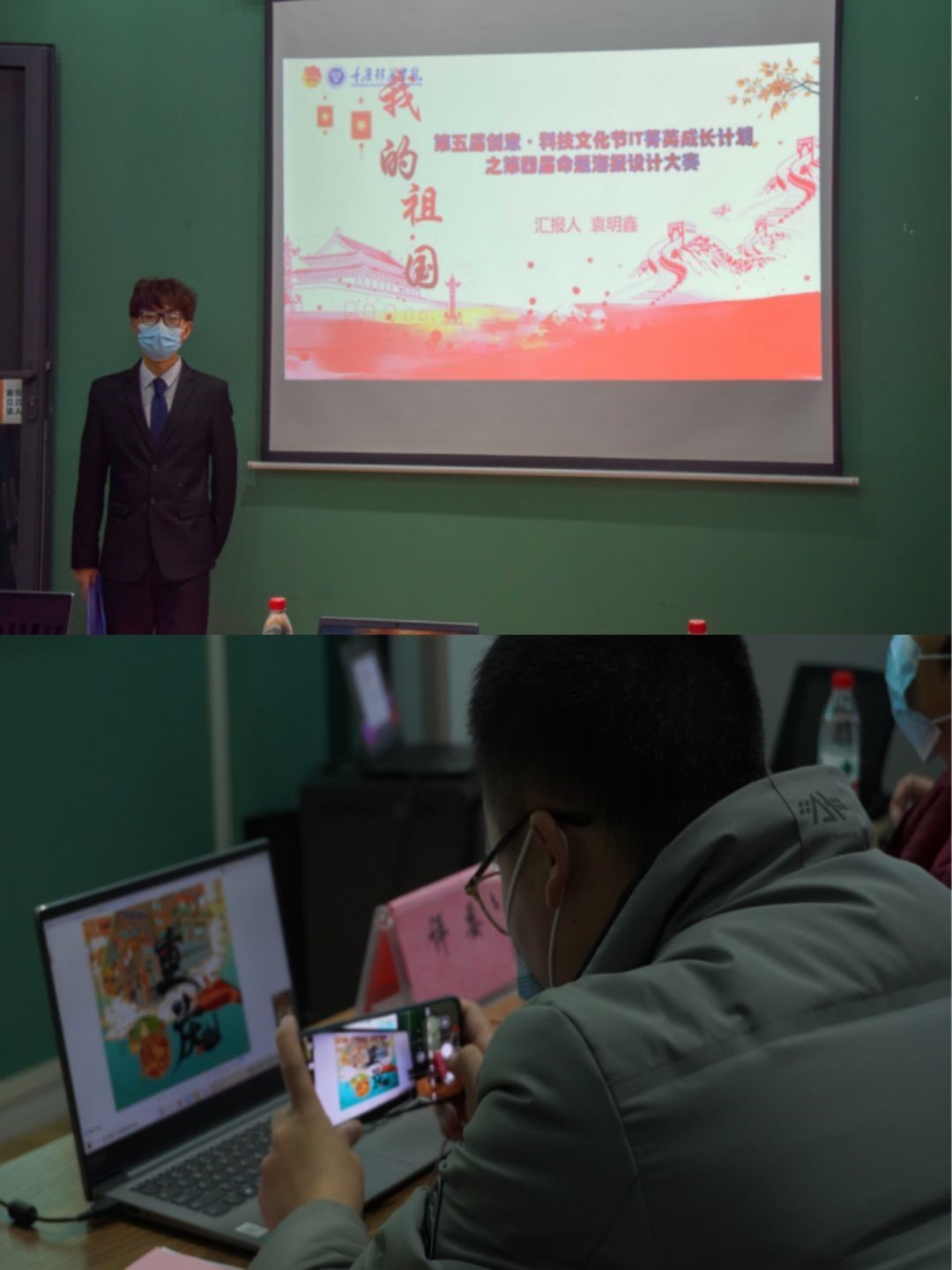 活动初期,指导老师和活动负责人共同商议海报主题,最终选择“我和我的祖国”作为本次比赛的主基调,由“城市印象”,“美好未来”两小标题供比赛选手进行大胆创作设计。本次比赛面向全校学生,各学院学生线上积极报名共计200余人,活动历时26天,经过专业评审最终选出15幅优秀作品进入决赛答辩环节。因疫情影响,决赛现场积极组织引导参赛学生做好个人防护措施,工作人员核验两码测体温做好登记工作。
