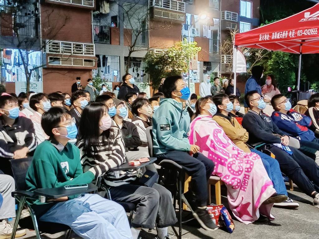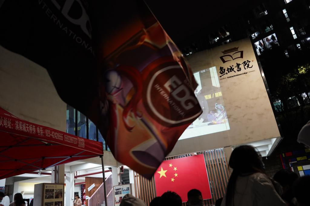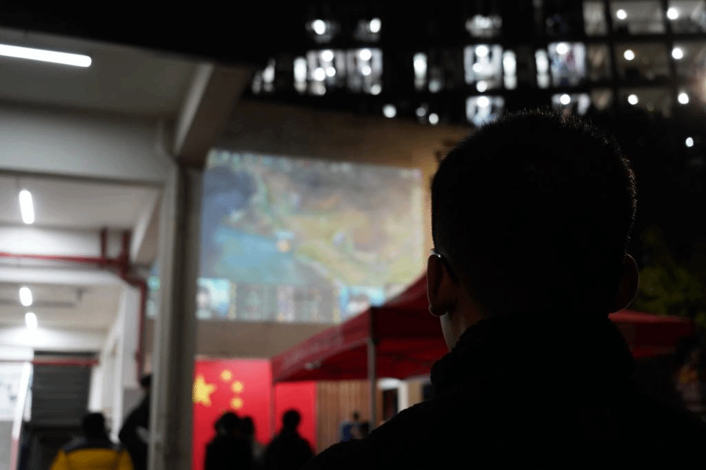 光影投射,LIVE开场,露天电影是一种情怀。当露天电影遇上电子竞技,更像是夜的狂欢。无数人的回忆集于一地,在一片欢呼声中,英雄联盟2021年全球总决赛S11决赛正式开始。来来往往的同学们无论是否是英雄联盟的玩家都纷纷为这精彩的“厮杀”停滞住脚步。电子竞技的魅力势不可挡,尽管严寒,也丝毫没有减退同学们摇旗呐喊为EDG战队加油的热情,“EDG NB”“EDG太帅了”“EDG干得漂亮”……不同场所响起相同的声嘶力竭的欢呼。而职业选手们的操作不同于同学们的激情,一进一退招招见血,每步走位、买装、开团,处处是谋划,精彩绝伦的比赛吸引了所有人的目光。屏幕内外两处“战场”相互呼应,线上与线下处处闪现着思维的锋芒,职业赛场和鱼城书院观战区的交错,更增加了活动的精彩程度。