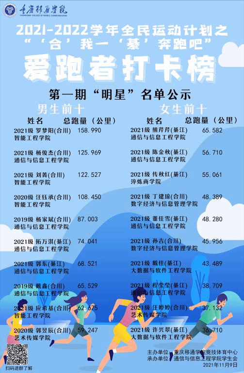 通信与信息工程学院坚持“健康第一,坚持运动”的原则,以“走出宿舍,走出网络,走向操场”为行动指南,在竞技体育中心指导下,以全校师生为主体拉开全民运动计划序幕,双校区联动举办2021-2022学年全民运动计划之“合我一綦奔跑吧”爱跑者打卡榜活动。第一期两周时间,双校区1000余名学生参与到活动中,总跑量达22987公里,相当于往返合川和綦江150趟。
