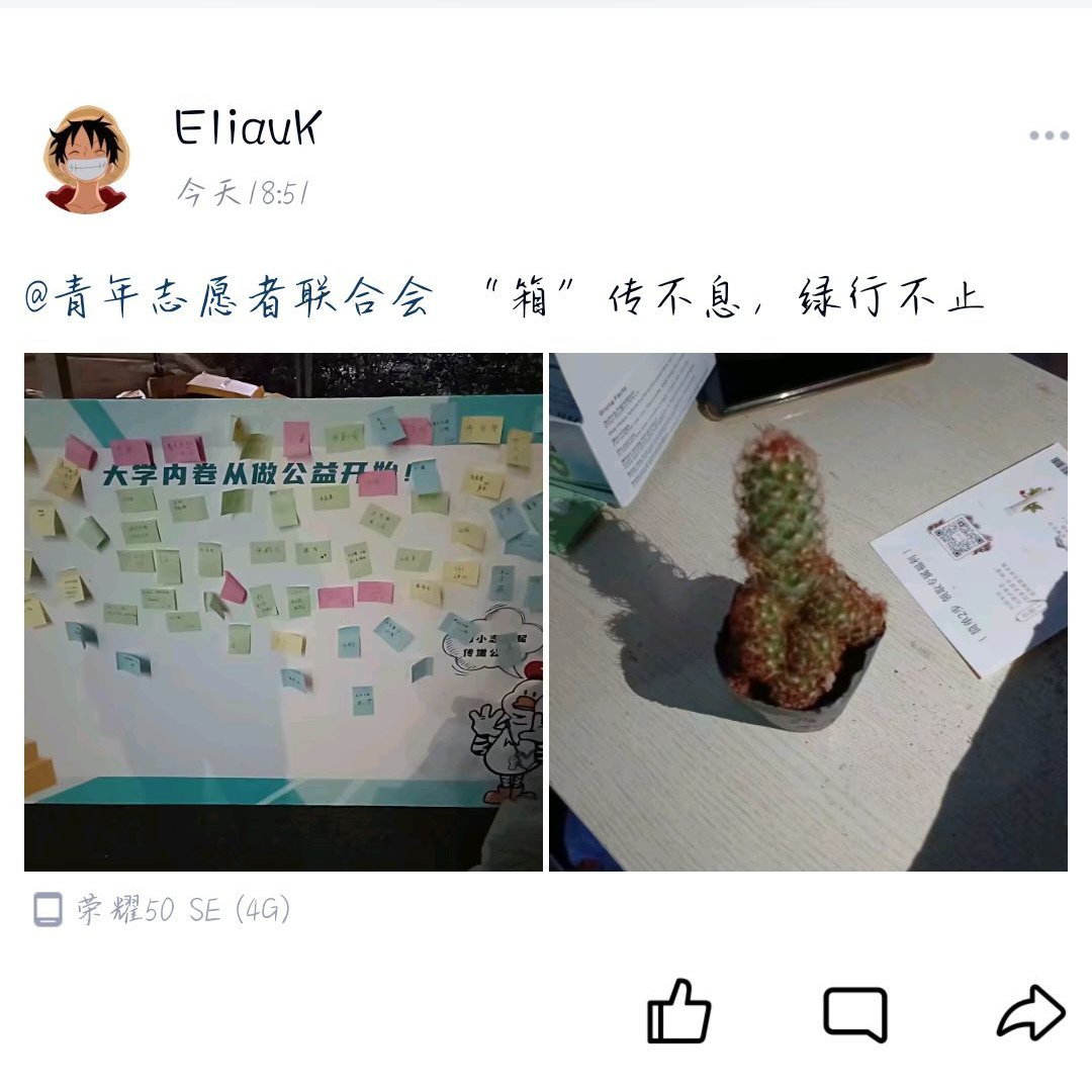 回箱活动形式新颖,我们在回收纸箱的同时还能获得一盆绿植,将绿色环保的理念延续下去。活动开展有重要意义,作为快递的普通使用者,每个人都有为绿色环保贡献力量的责任。希望回箱计划可以继续开展,让“绿色”成为建立美好校园的一部分。