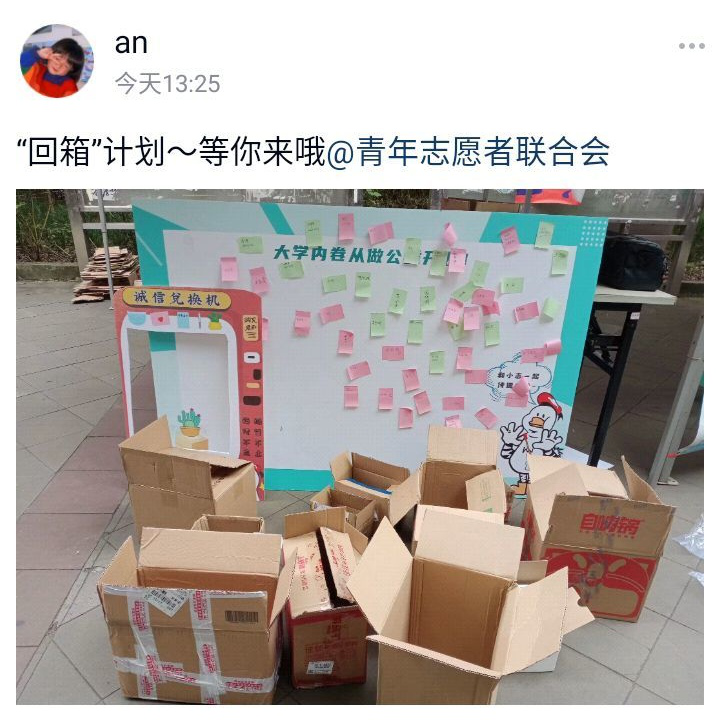 为进一步做好常态化疫情防控工作,按照上级疫情防控具体要求,此次“回箱计划”活动及时调整、积极响应,在内容和形式上都有很大的创新。本次活动采取无人自助交换方式,一人值班清理纸箱,参与者自助兑换物资,同时活动增设口罩、消毒湿巾等与防疫相关的兑换物资。希望借此活动助力校园常态化工作建设,传播保护环境,人人有责的可持续发展理念,更呼吁师生在疫情防控背景之下做好自身疫情防控工作。