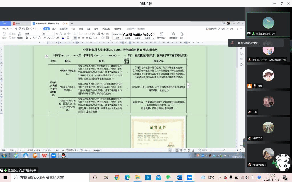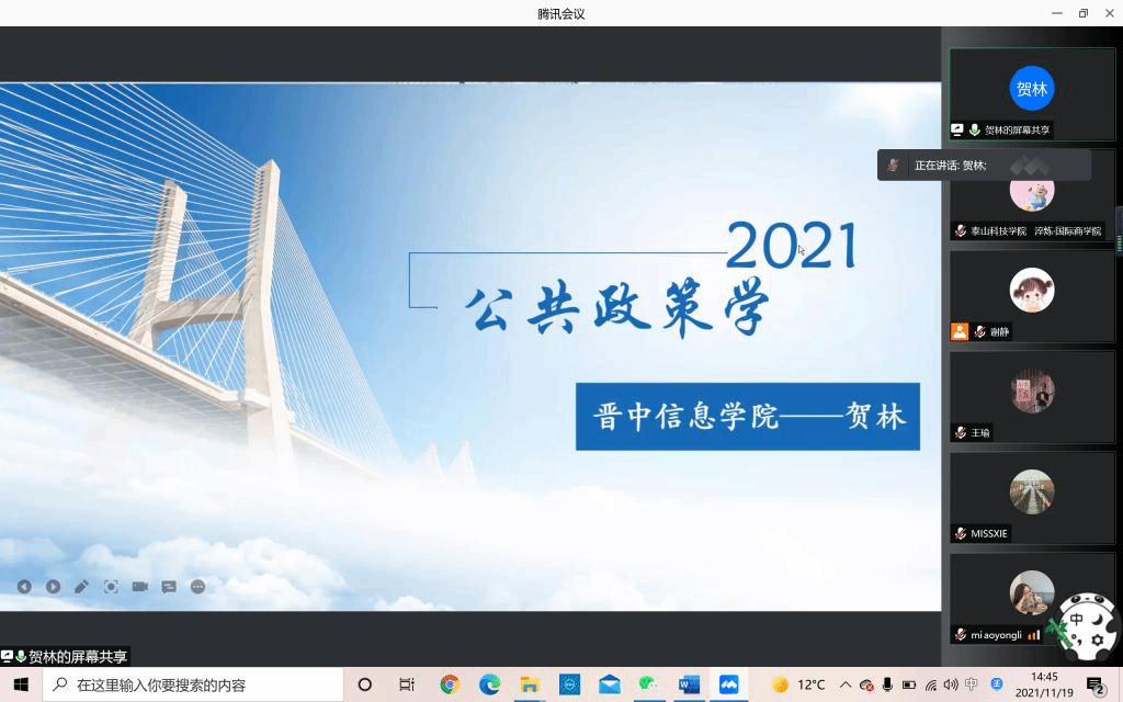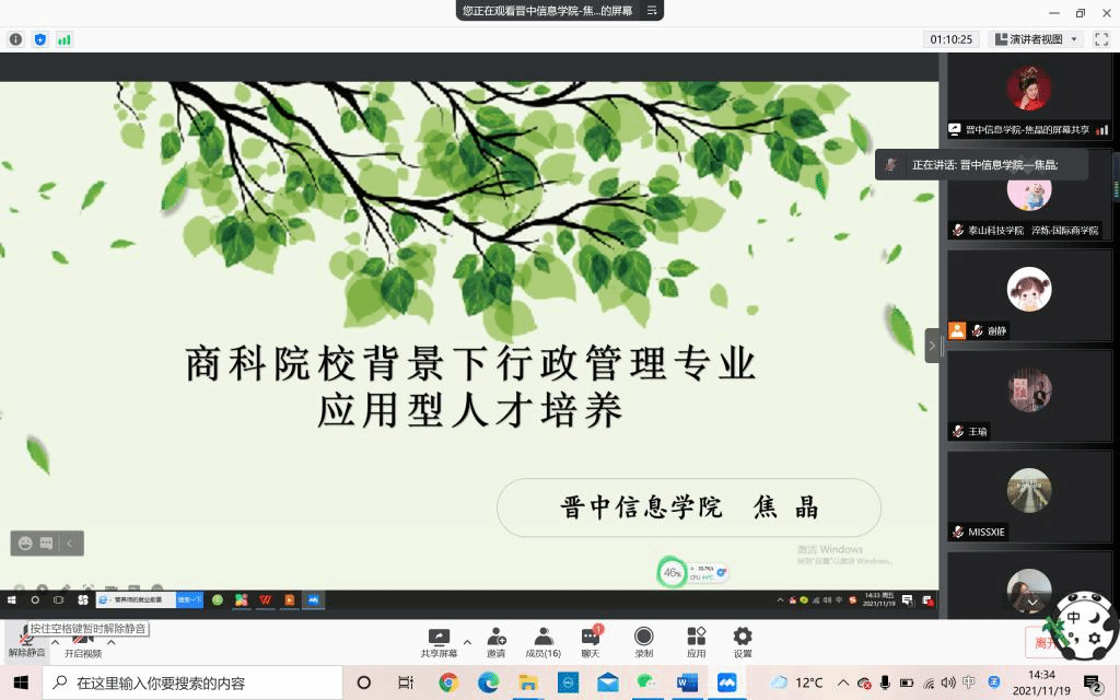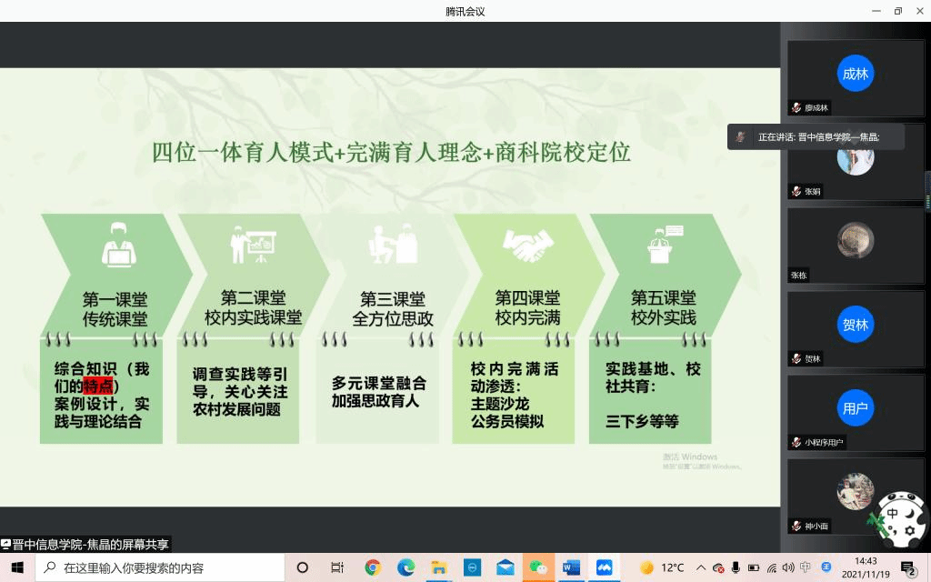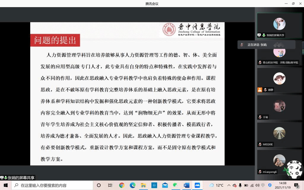 本次会议以腾讯会议的形式进行,充分兼顾了三校各地老师们的时间协调问题,极大提高了沟通效率。三校教师代表分别对商科教育和人才培养方面做了相关分享。重庆移通学院杨宝石老师和泰山科技学院牛敏老师分别介绍了2021-2022学年新商科教育推进工作;晋中信息学院张娟老师为大家分享了人力资源管理课程中“课程思政”教育理念的融入思路;焦晶老师分享了商科院校背景下行政管理专业应用型人才培养的工作问题。老师们在交流过程中,互相借鉴经验,激发创新灵感。