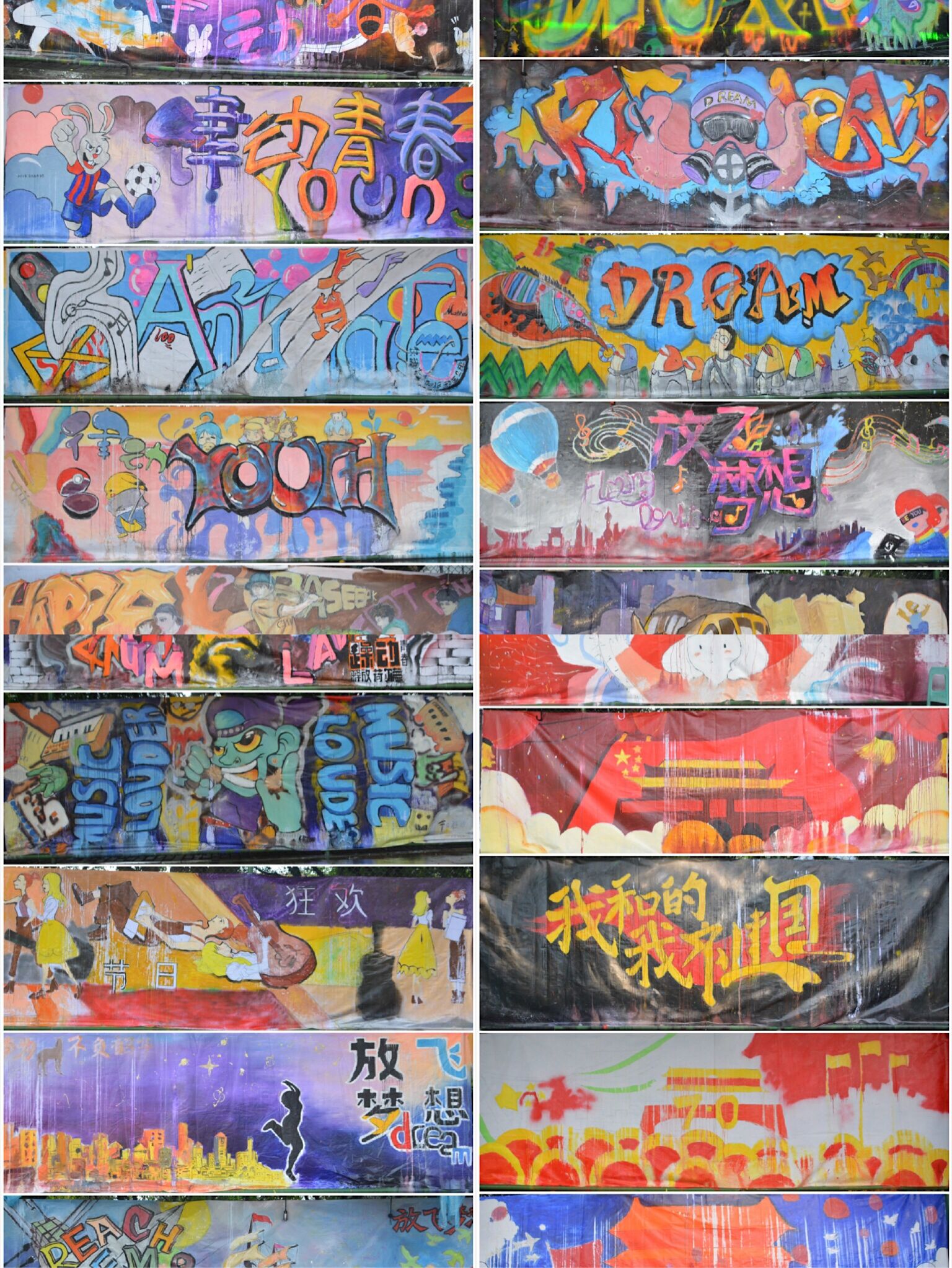 大学城·钓鱼城国际音乐节的精彩不止于此,除了每天的音乐舞台表演,还有一系列音乐节外围活动正在火热进行中。为营造浓厚的音乐节氛围,由校完满教育主办,艺术传媒学院联合学校各书院、社联、青联共同参与完成了音乐节外围活动之“拥抱狂欢”校园大型主题涂鸦活动。色彩的交融,让眼前焕然一新;音乐的响起,将你带入其中。在感受艺术的同时、也能随音乐释放荷尔蒙。此次涂鸦包括了志愿青春、音乐狂欢、律动青春、祝福祖国、运动快乐等主题,融入了“完满教育+专业教育+通识教育+商科教育”四位一体的育人理念,充分发挥了学生的专业优势与积极性,历时两周完成了创作,为2019年国际音乐节增添了浓厚的气氛与氛围。
