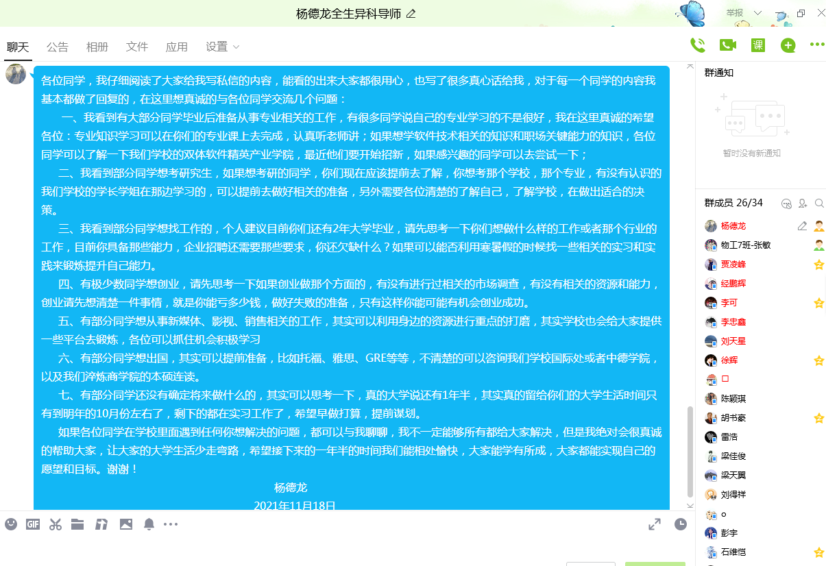 杨德龙老师制作了工作台账,以私信的方式和同学们进行了初步交流,对各位同学的基本情况有了一定了解。此外,杨德龙老师将每位同学的毕业愿望、目前的学习情况以及自己的期望都做了归纳总结,并就这些内容给出了自己的建议和指导。