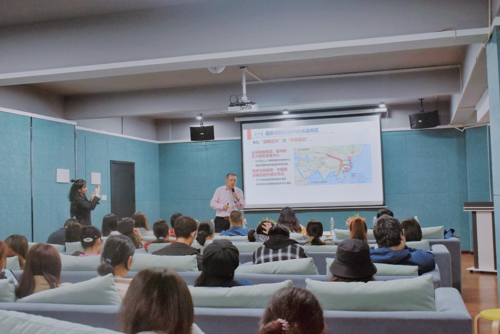 讲座过程中,王老师深切结合城市的地区分布,城市间的发展形势,政府的实时政策以及疫情的时代背景为同学们生动地解析了城市、地区甚至是一带一路政策下遍布亚洲的丝绸之路对空间领域规划学习方面的深刻意义。同时生动形象的例举了成都与重庆间空间领域规划的异同,并贴切的将成都和重庆的女孩子分别比作水蜜桃和菠萝,告知男孩子们要用对待不同水果方式对待不同地域的女孩子,逗得认真聆听的师生开怀大笑,讲座间充满欢声笑语。