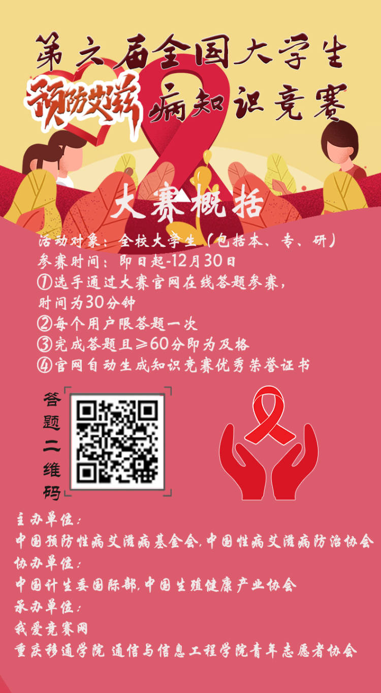 为提高人们对艾滋病防控的认识,唤起人们对艾滋病的重视,科普艾滋病相关知识,通信青协协助中国预防性病艾滋病基金会和中国性病艾滋病防治协会举行第六届全国大学生预防艾滋病知识竞赛。通过知识竞赛的形式,让移通学子了解并切实掌握艾滋病预防知识。