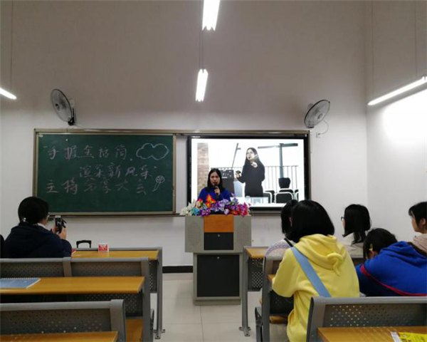 为培养大学生的口头表达能力,丰富大学校园生活,为我系爱好主持及有主持才艺的学生建立一个展现自我的舞台。2019年3月12日晚 18点,由外语系艺术团举办的主持人分享大会在天渠书院104召开,本次活动特邀外语系2016级学姐谭建英为大家分享她的主持经验。外语系辅导员黄灿老师,艺术团主席刘欢与干部干事们参加了本次分享大会。