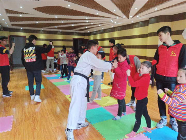 2019年3月23日,志愿活动如期在沙坪社区举行。寒潮在这几天时间侵袭了合川区,密密麻麻带着寒冷的细雨却抵挡不了志愿者们的热情。跆拳道和散打都能很好的锻炼身体,我们的志愿者活动在宣扬了跆拳道礼仪、廉耻、忍耐、克己、百折不屈的精神的同时也更好的体会了散打的独特魅力,为小朋友们多增添了一份爱好!左拳、右拳、拳拳有力量!一个一个动作细心指导,一次又一次地重复为了做的更好。克己忍性,礼仪见心,志愿者们希望小朋友们可以走上坚韧之路。小朋友们虽然累却也在其中享受对跆拳道的热情也是与日俱增。正所谓:赠人玫瑰手有余香,在与小朋友们相处的过程中,看到了小朋友身上的那份童真与坚持,也深深激励着志愿者们的心。