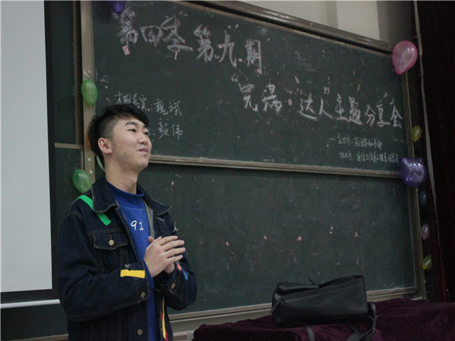 颜伟学长作为一名特邀嘉宾,一上场就用不同方式让大家对他有了一个新的认识。互动游戏,苗族山歌,他样样都能行,让现场的同学们都感受到了他的多才多艺。当然,人前的光辉,总是离不开背后的努力。为了自己的学业,不惜跑到隔壁学校,找到老师去求学,一有空就去上课,去学习,去提升自己;为了一次演讲比赛,就找到老师,在老师吃饭的时候抓紧联系,拉着老师排练到深夜,五小时的演讲稿创作,无数次的修改,只是为了让大家感受到那震撼人心的力量,学长还分享到,在演讲比赛时,看到台下被他讲哭了,自己也跟着一起哭,回想起自己为这次比赛的付出得到了观众的认可,我想学长的眼泪也是幸福的。过程虽是艰辛的,但是结果却美好的。一步步的前进,一次次的感动,终于拿到了最后属于他的冠军。比赛众多,但是自己的工作却是没有放下。从最开始的搬桌子,到写稿子,再到自己能站在舞台上独自的主持节目,循序渐进,终于成为了一团之长,成为大家眼中的耀眼新星。而这就是颜伟,一个真实的,愿为自己的梦想去努力,去奋斗的达人。