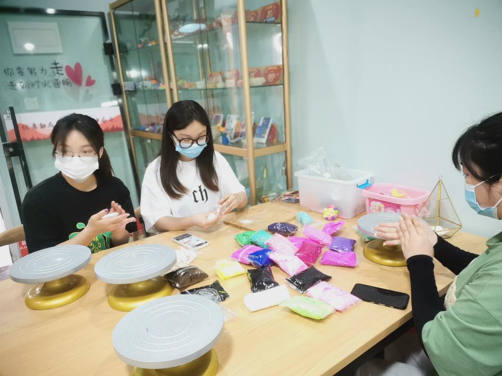 活动现场学生们玩的非常开心,期间有的同学做了冰墩墩,有的捏了小狗、蛋糕,有的同学做了泥塑等等。徐老师和陈老师则带着两位同学制作了手工精油皂,通过网上教学的步骤,大家做出来的肥皂都非常好看,肥皂的形状与众不同,有狮子的熊熊的爱心。整个活动过程老师和同学们齐心协力,共同完成了自己满意的作品。