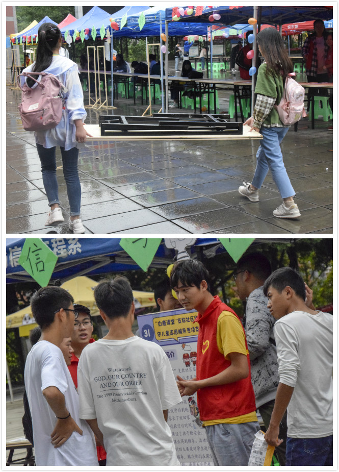 9月17日清晨,招新工作如期开始,虽然天公不作美,但黄桷树广场的每位志愿者都坚守在岗位,不惧风雨,认真对待工作,厉兵秣马,以最大的热情迎接小萌新。风里雨里志愿一直在这里等你。