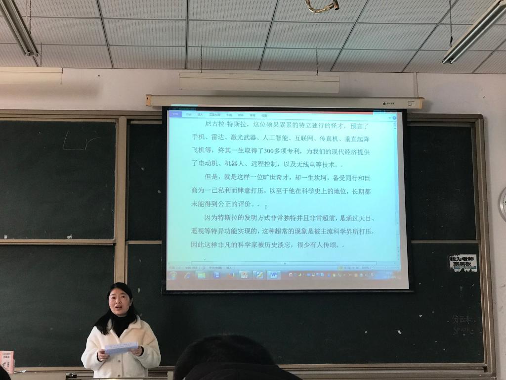 俸世洲老师讲述了对最后一章——永在时代前头的收获。首先介绍了没有获得诺贝尔而发生一系列的故事,体现了特斯拉骄傲、奇特的性格。还介绍了他是一个不妥协、充实、坚持的人。最后讲述了作为一个普通人,应该认真学习,热爱生活,积极向上。结合到我们所从事的教师这个职业,在教学过程中,应该给怪才留一点发展空间,让他们去发展自己的兴趣爱好。