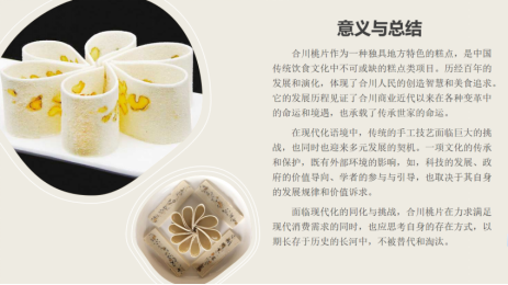 合川桃片历经百年的发展和演化,体现出的是合川人民对美食追求和对传统文化继承与发展的决心。它的发展历程更是见证了合川商业近代以来在各种变革中的命运和境遇。通过这次讲解,让大家深刻体会到合川桃片背后精益求精的工匠精神,对处在这快节奏时代的同学们来说弥足珍贵。作为当代大学生,铭记历史经典,继承美食文化内涵,珍惜每一次与传统美食的相遇
