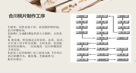在合川桃片制作过程上徐靖以图表的形式展现,合川桃片历经百年的实践,其制作形成严格的工序流程,从每一个环节的处理和衔接都将影响到桃片的质量。桃片的制作严格讲究,从磨粉到发酵,再一层一层的压实,做完这些仍需要等待一天才能制作完成。同学们充分认识到前辈们的智慧与毅力。通过对桃片制作的学习,同学们除了感叹前人的心灵手巧,更应该担起传承责任,让这精巧的手艺得以永传。