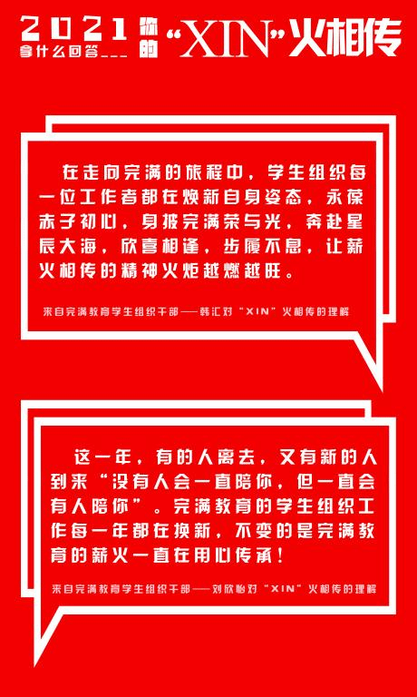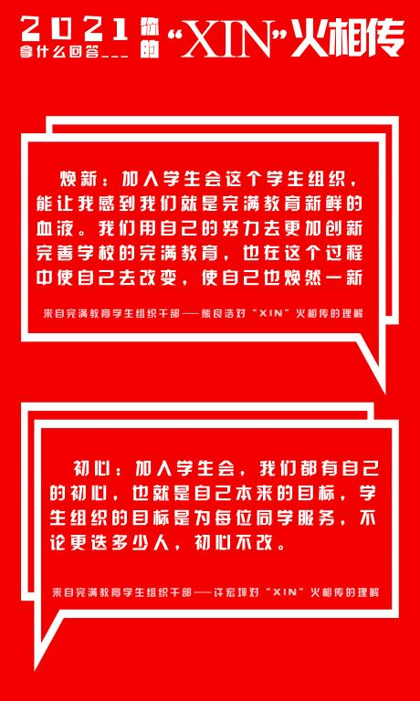“XIN”会是焕新,回望这一年我们厚积薄发提质“焕新”,为完满教育注入新鲜血液;会是初心,我们步履坚定永葆“初心”,牢记完满教育赋予自身的使命;会是欣喜,我们在完满阵线上“欣喜”相逢,身披完满荣光欣然启程;也会是薪火,我们在双校区、组织传承上“薪火”相传,在完满旅程上齐心合力。