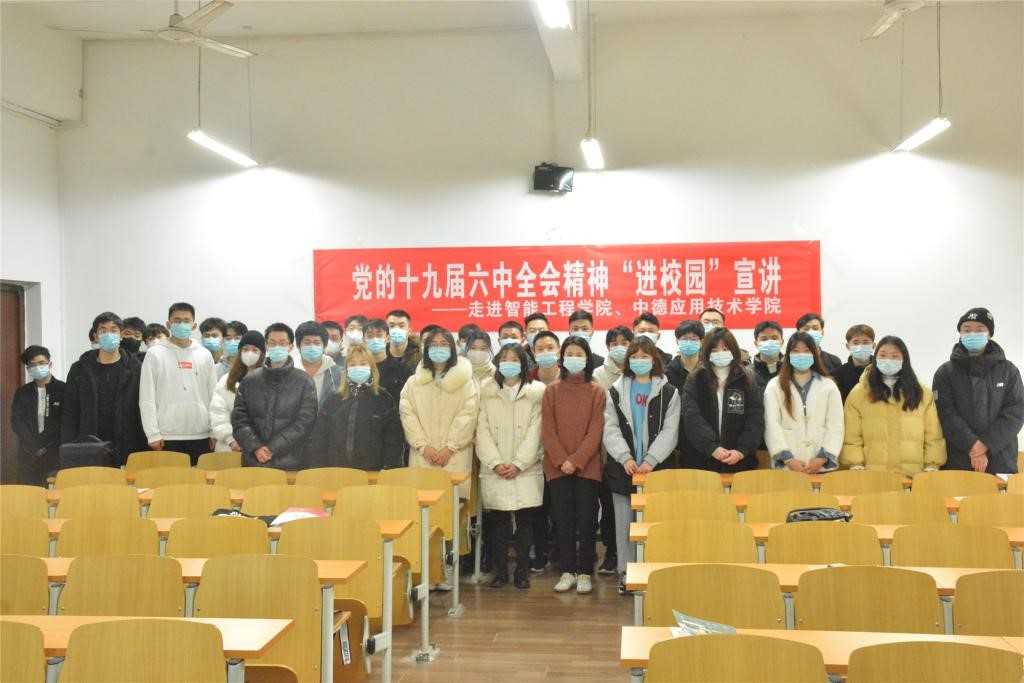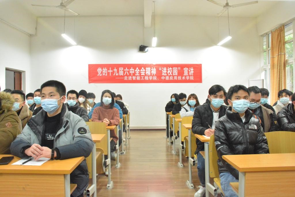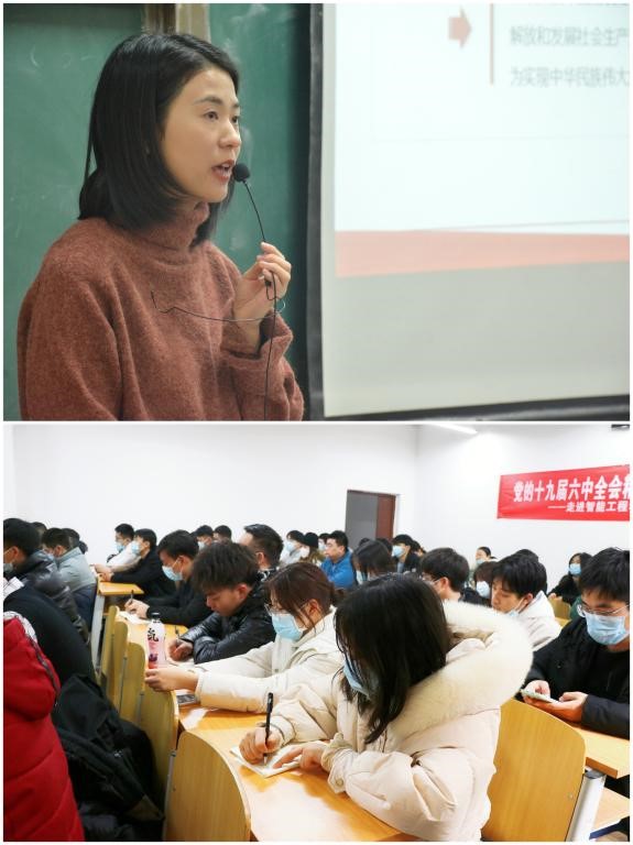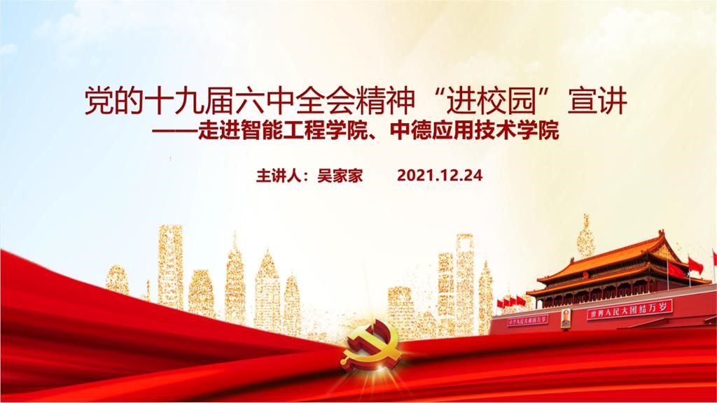 为推进党的十九届六中全会精神进校园、进课堂、进师生头脑,在学校掀起学习宣传贯彻党的十九届六中全会精神热潮,根据市委教育工委印发的《党的十九届六中全会精神“进校园”宣讲工作的通知》,结合《重庆移通学院党的十九届六中全会精神宣讲工作方案》,2021年12月24日16时在7202教室开展“党的十九届六中全会精神进校园”宣讲活动,智能工程学院辅导员吴家家老师主讲,智能工程学院和中德应用技术学院部分学生党员代表参与本次学习。