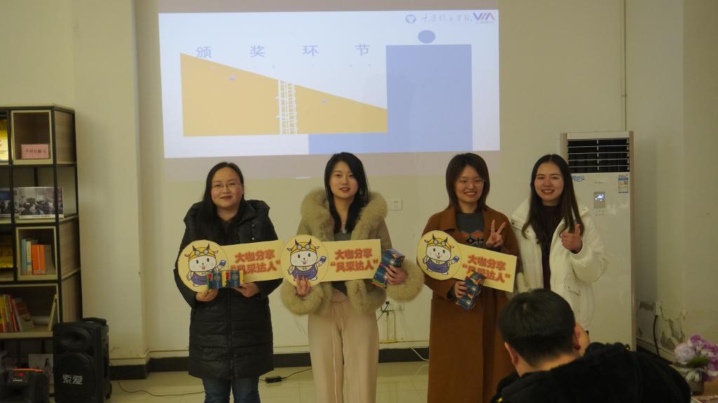 分享会上,廊桥书院千禾烘焙坊为大家准备了冬日温暖小食,“限定盲盒”、“你话我猜·玩转大咖”的游戏环节更是为分享会平添了无尽的欢乐,在场的老师和同学们一起头脑风暴给游戏参与者出谋划策的场面将分享会推向了高潮。最后,通过现场投票的方式,大家评选出了自己心目中的各类达人,廊桥书院也为各位达人送上了精美礼品作为鼓励。