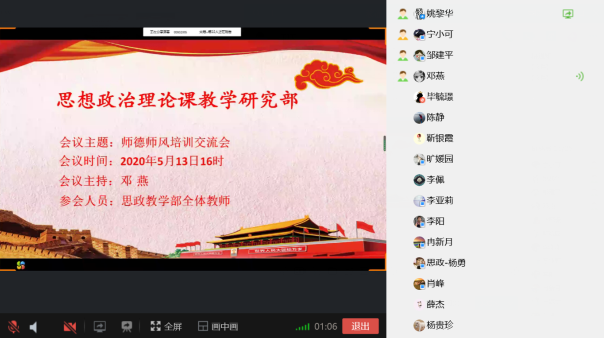 育有德之人,需有德之师。为进一步加强师德师风建设,增强思政课教师“立德树人、教书育人”的使命感和责任感,同时提升教师们崇德敬业的思想意识,规范教育教学行为,5月13日下午,思政教学部在线上举行师德师风培训交流会。会议由教学部主任邓燕主持,思政教学部全体教师参加。