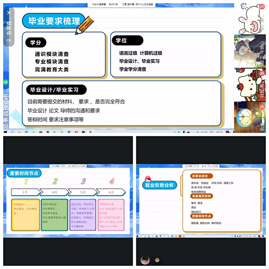 大四学子云相聚,共话学期新愿景。2月22日21时,2018级辅导员郭淼老师召开线上主题年级会,为大四的同学们一一梳理了毕业的相关要求,重要事件及时间节点;分析了当前的就业形势、综合考研和就业情况;给同学们提出了合理的建议。课堂上,郭老师通告了学校疫情防控、返校返合的相关管理规定,新学期伊始,她对同学们表示了诚挚美好的祝愿。