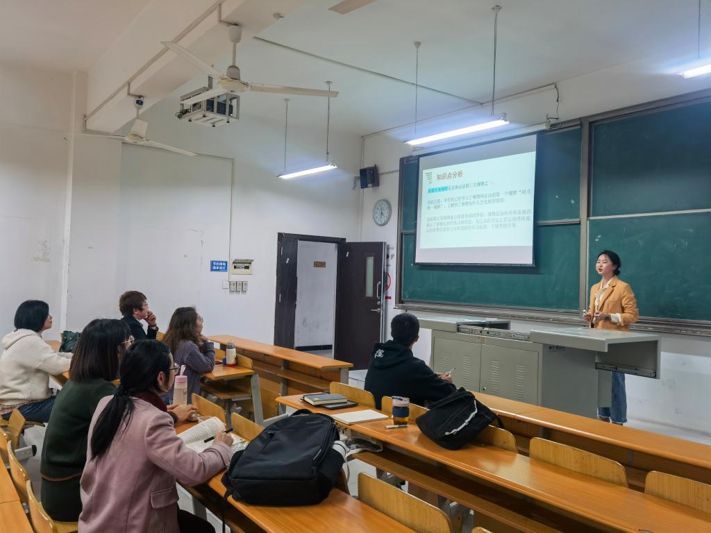 首先,来自马克思主义基本原理专业课的新进教师张铭瑶展开了说课分享。张老师在对知识点进行简要分析之后,分别从教学目标、教学内容、教学方法以及重难点四个方面展开说课内容。在说课过程中,新教师表现出了饱满的热情和十足的信心,对说课的各个环节的把握主次分明,对教学目标和教学过程进行了重点描述。