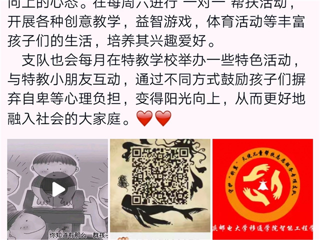 为共抗疫情,即使莘莘学子不能返校,也通过直播教学、网络视频教学等各个渠道汲取知识,同时为丰富他们在家学习的生活,各类活动的开展也是绘声绘色。2020年4月8日,守护“折翼”天使儿童帮扶志愿服务专项支队开展线上活动——“听听”他们的声音。旨在通过视频、文字配合着问卷让更多人了解到特殊 儿童这个群体,并加入到帮助特殊儿童的队伍中来。