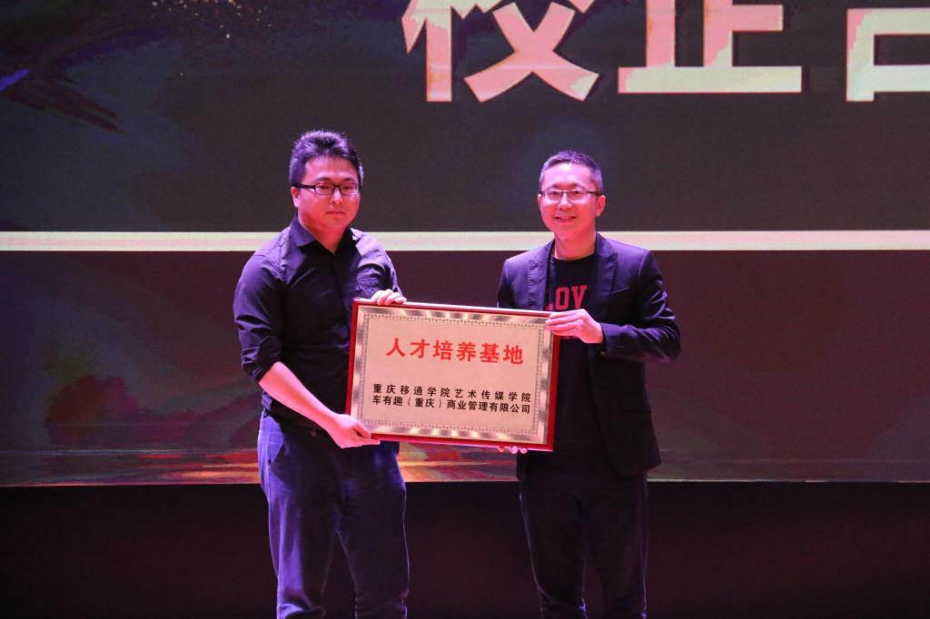 致辞后,陈庆龙先生代表车友趣(重庆)商业管理有限公司,校长助理张衍学老师代表学校互赠校企合作牌匾。校企合作可以搭建更多实习实训的机会,欢迎更多企业家多来移通走一走看一看,共同在人才的培养方式上探寻一些新的合作方式及领域,进一步拓宽人才面向市场,以实践作品输出为主,实现学校、企业、学生以及社会的多赢,校长助理张衍学讲到。