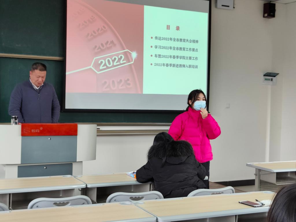 在潘显兵院长强调教学质量与疫情防控之后,同时也不忘欢迎在今年春季新入职的五位老师:李敏、陈垍欢、唐也茜、谭春莉、肖渝。潘显兵院长在会议上对新老师们做了一个简单的入职培训。从上课多媒体的调控到授课的规范要求,以及每学期课后作业的布置和批阅等。