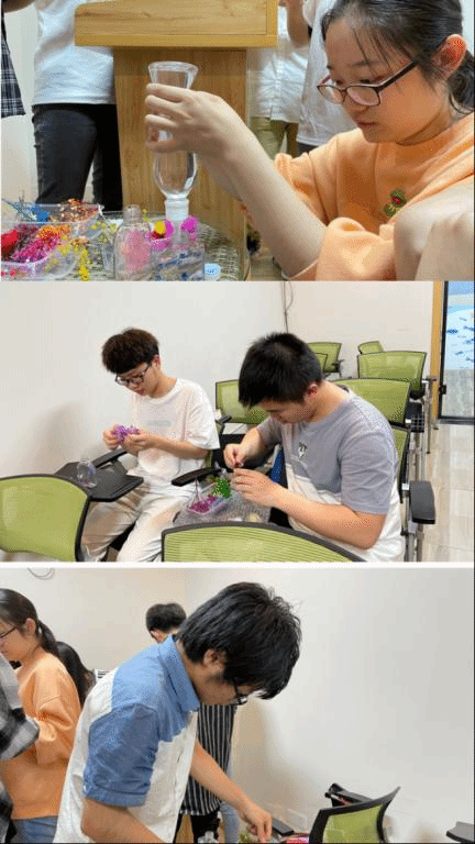 在制作的过程中,同学们开始发挥学习的主观能动性,各自表达对创作的想法,在社长罗逸欢同学的建议和修改后开始着手创作。透明的玻璃瓶,修建琐碎的花枝,由镊子放入,灌上油,便是存着春天的浮游花。