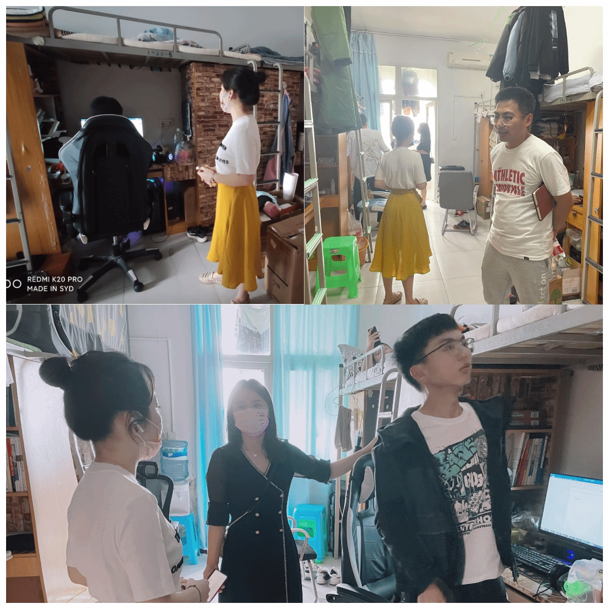 为了更好的了解同学们的学习情况,在辅导员的邀请下,异科导师和辅导员一起走进学生寝室,对同学们进行关心慰问,询问大家的学习情况,同学们都积极配合并热情回应。