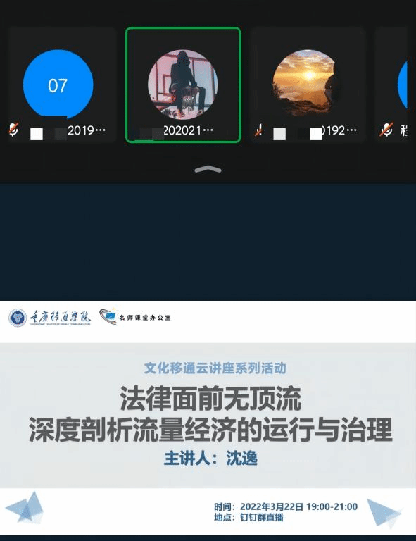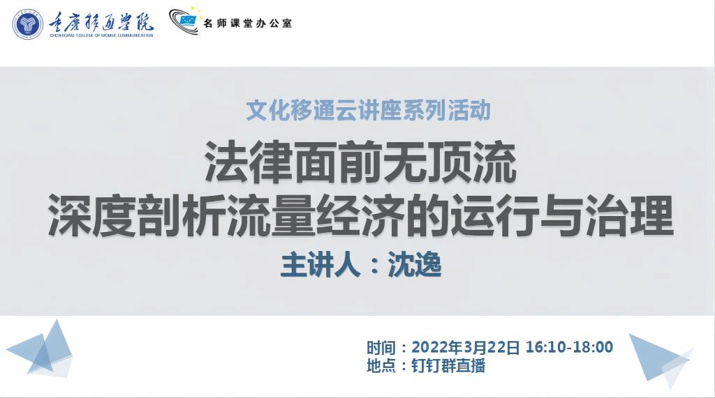 人们生活水平日益提高的当下,流量经济开始盛行,资本高呼着“渔翁获利,尽在流量”,市场经济秩序被不良的流量严重扰乱。3月22日下午4点,文化移通云讲座研讨会通过复旦大学国际政治系教授沈逸老师的《法律面前无顶流,深度剖析流量经济的运行与治理》让流量经济暴露得淋漓尽致,给大家上了一场生动的经济学课程。