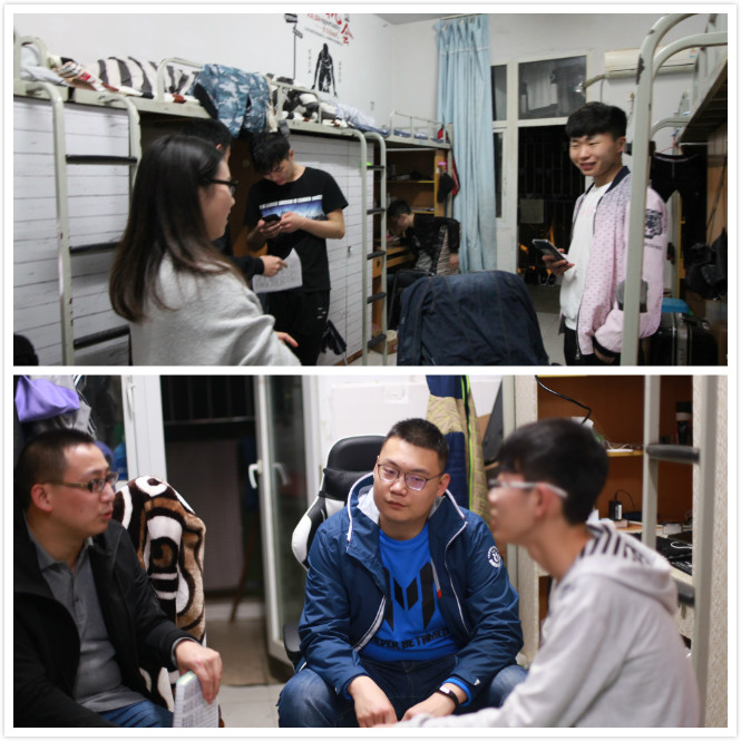 3月廊桥书院三位发展导师孙庆涛、赖昌容、常乐带着学生干部于3月14日,3月21日两次走访宿舍,遍布宿舍10余间,覆盖人数超过40人,老师们坐下和学生畅聊学习生活中的趣闻,书院建设的愿景、给书院的建议等。