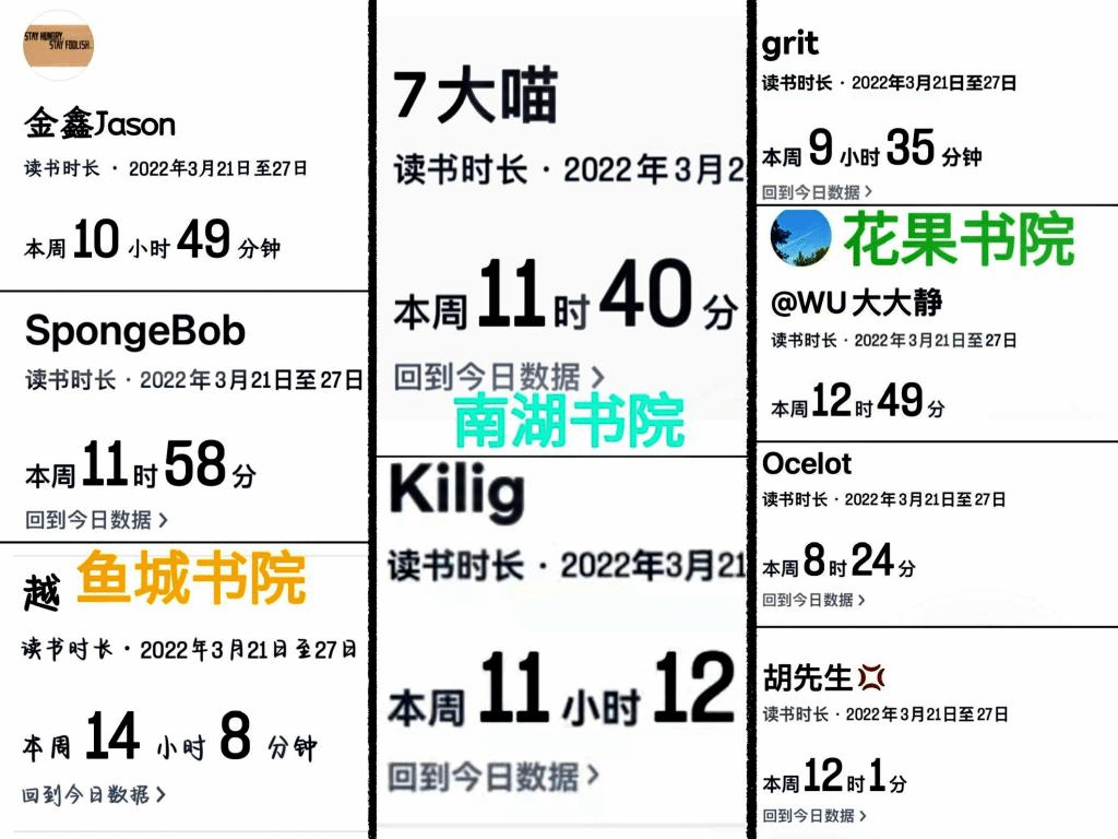 读书不觉已春深,一寸光阴一寸金。3月21日,书院部合川校区与綦江校区42名老师依托“微信读书”相约开启为期一周的 “开卷18000” 大咖传记线上阅读挑战赛。截至3月27日24点,书院部全体教师阅读总时长22356分钟、人均阅读时长532.5分钟,远超原定目标18000分钟。鱼城书院、南湖书院、花果书院分别以人均阅读738.3分钟、686分钟、642.25分钟荣获本次线上阅读挑战赛前三名,获得“最佳挑战团队”称号。活动期间,大咖传记阅读成为老师们茶余饭后的主要话题,《董明珠与格力》《雷军传》《爱彼迎传》等大咖传记成为月度热门书目,数字可以丈量时间,却诉不尽大咖人生,时间虽短,习惯已成,书院师生阅读的计时器将永不停止。