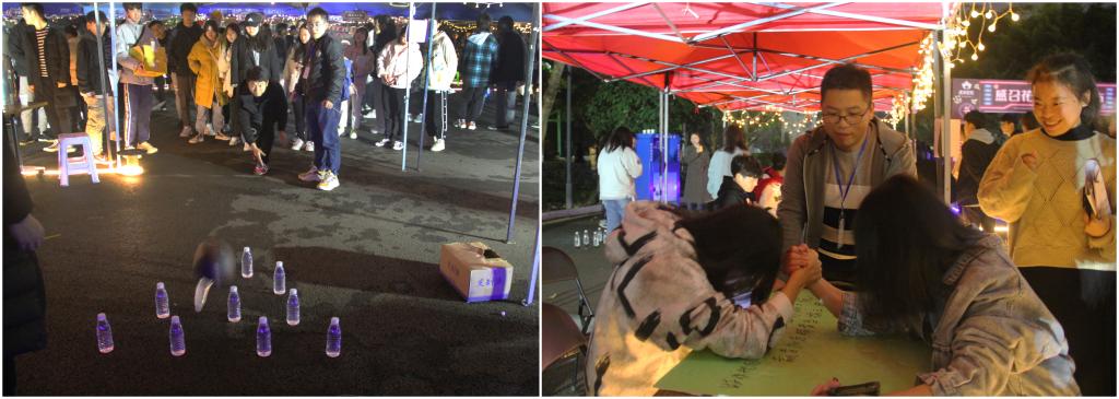 “你画我猜”,你画的是梦想,我猜的是感悟。花果书院邀请到了沙画协会为各位“画家”加持,为大家带来全新体验;有一种声音可以抚慰你的心灵,配音社在本次夜市中展示了声音的力量,带领大家“声临其境”,不少同学也被触动,现场配音,感受其中乐趣;“镖王争霸”中同学们各个仿佛都是“小李飞镖”,跃跃欲试,成绩斐然;校乐团拿起话筒,拨起琴弦,为大家娓娓道来,故事都在歌里,话筒的交换是书院学子的尝试和勇气;足球变身保龄球,击倒的水瓶是大家的青春和热血,是洋溢的快乐。棋盘对决、狼人杀、三国杀三个游戏引爆全场,络绎不绝的队伍在排练厅和咖啡厅展现自我魅力。